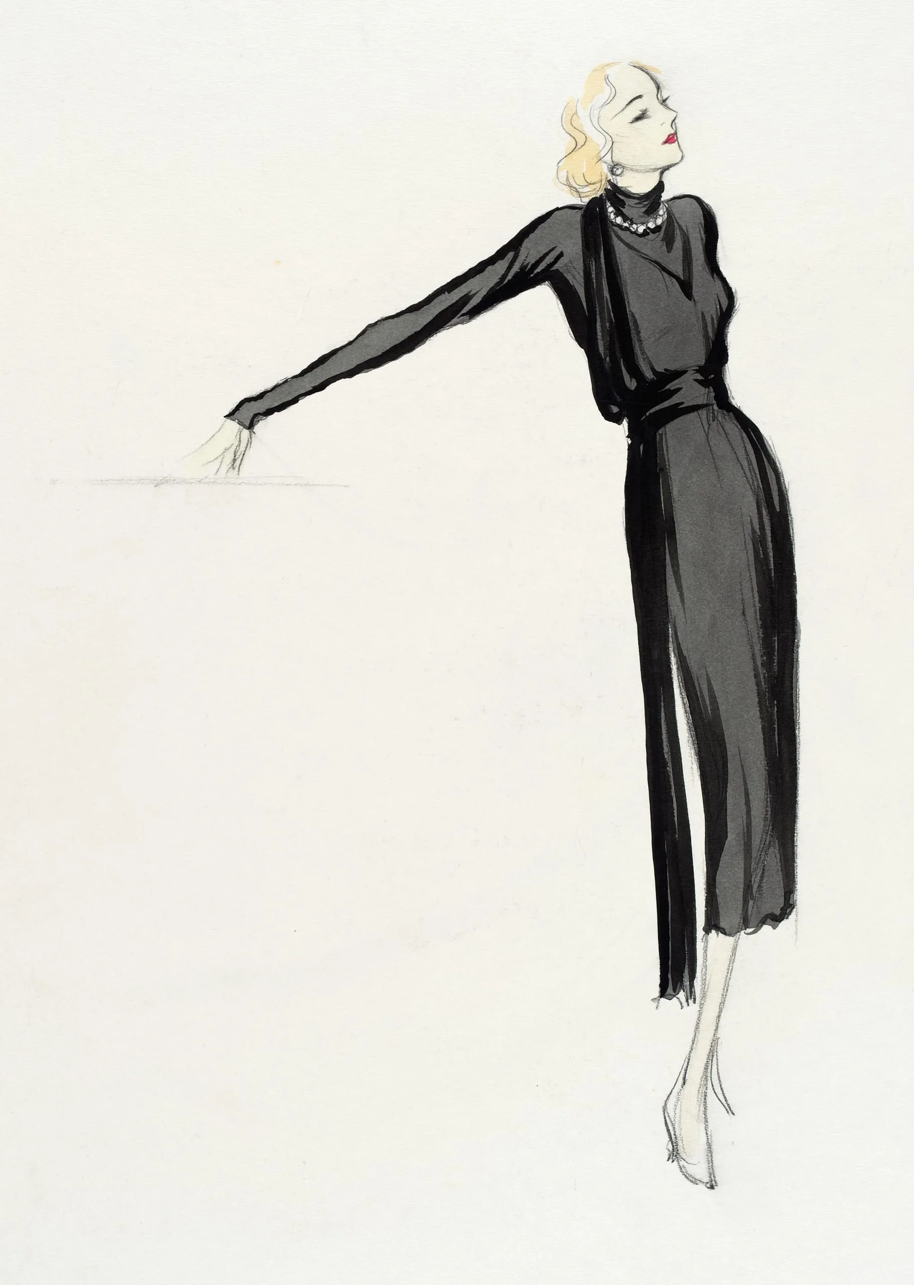 Fashion illustration in black ink wash and watercolor on cream paper, a blonde woman in a long-sleeved dark dress leans forward with one arm extended