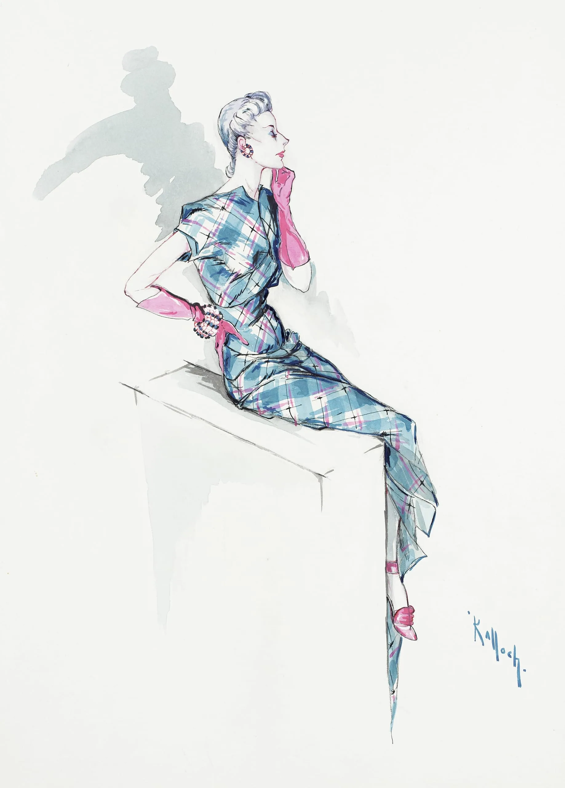 Fashion illustration in ink and watercolor of a woman in a teal plaid dress and pink gloves seated on a white block, shown in profile, with loose brushwork and a gray cast shadow behind her