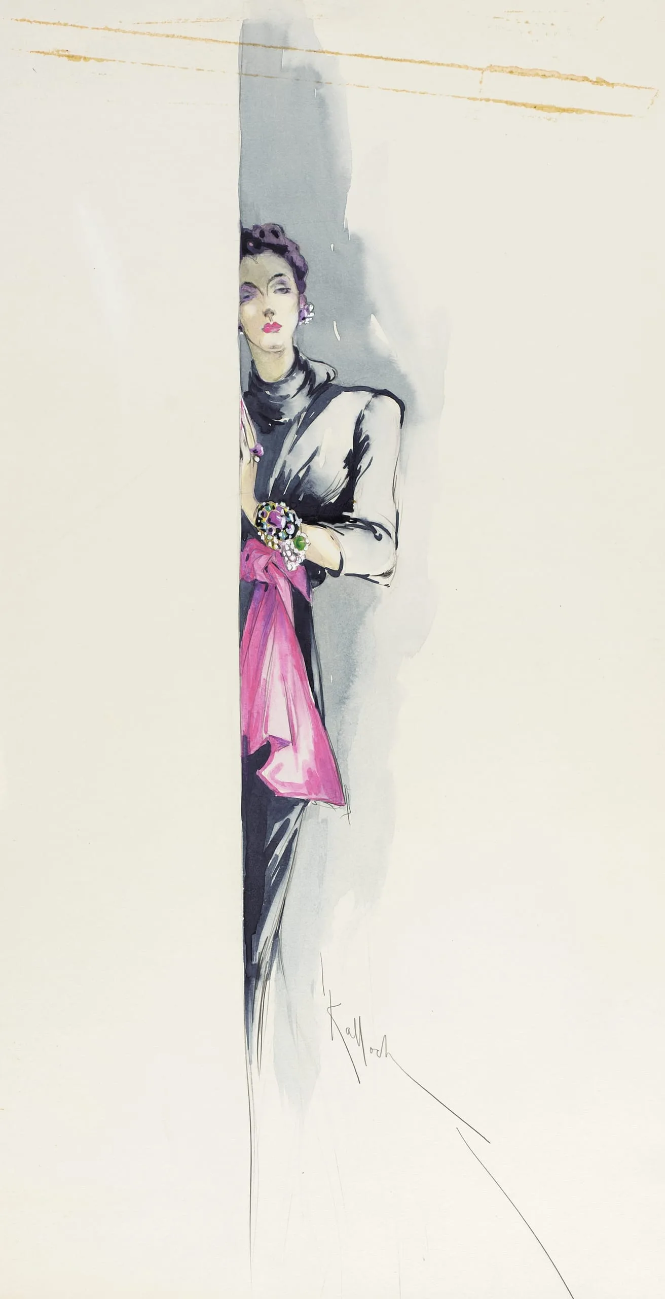Watercolor and ink fashion illustration, vertical format, a woman in a charcoal gray gown with a magenta bow at the waist, body facing left, head turned toward the viewer