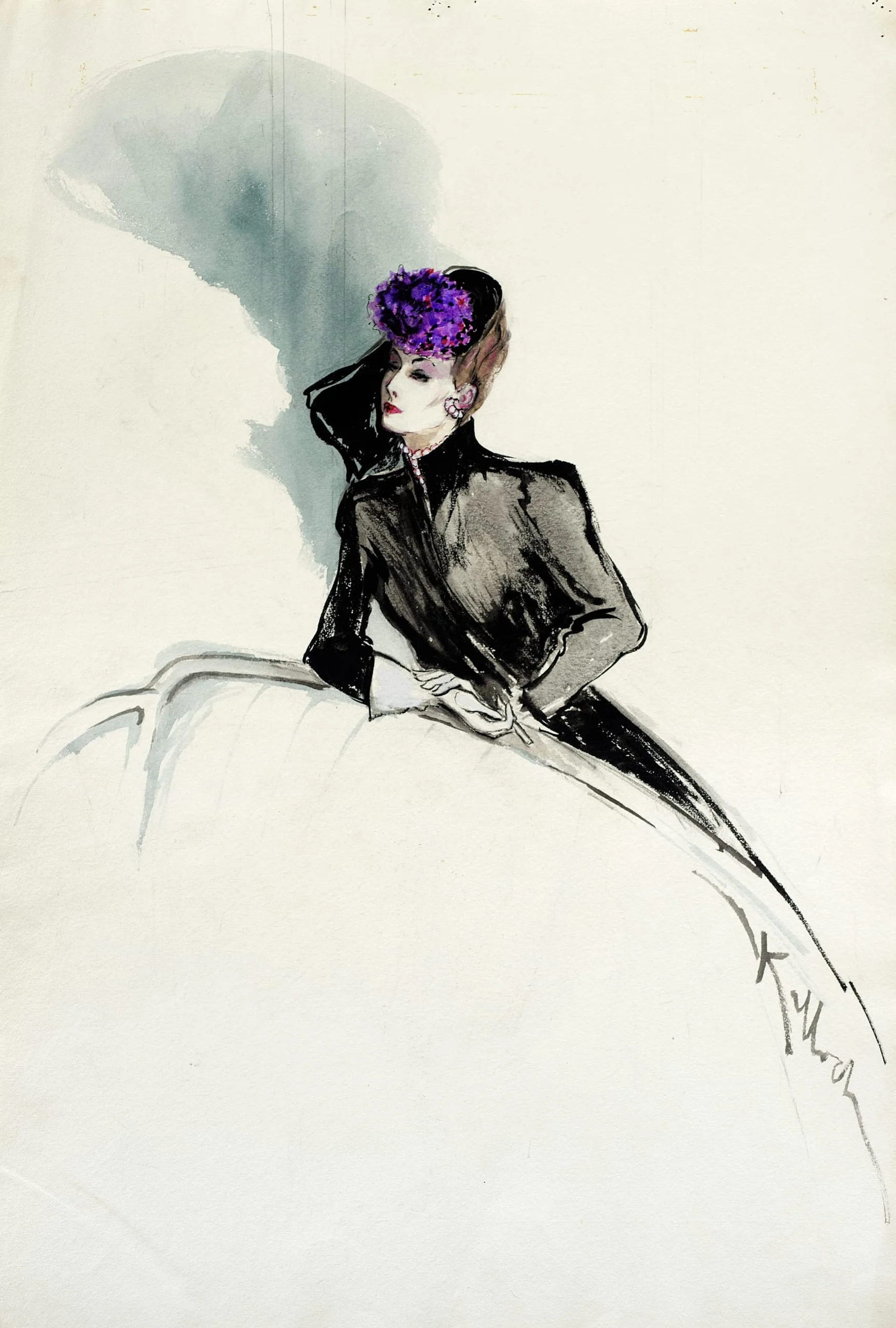 Fashion illustration in black ink and gray wash with violet watercolor, woman in profile wearing a structured dark jacket and voluminous pale skirt, gestural brushwork on cream paper