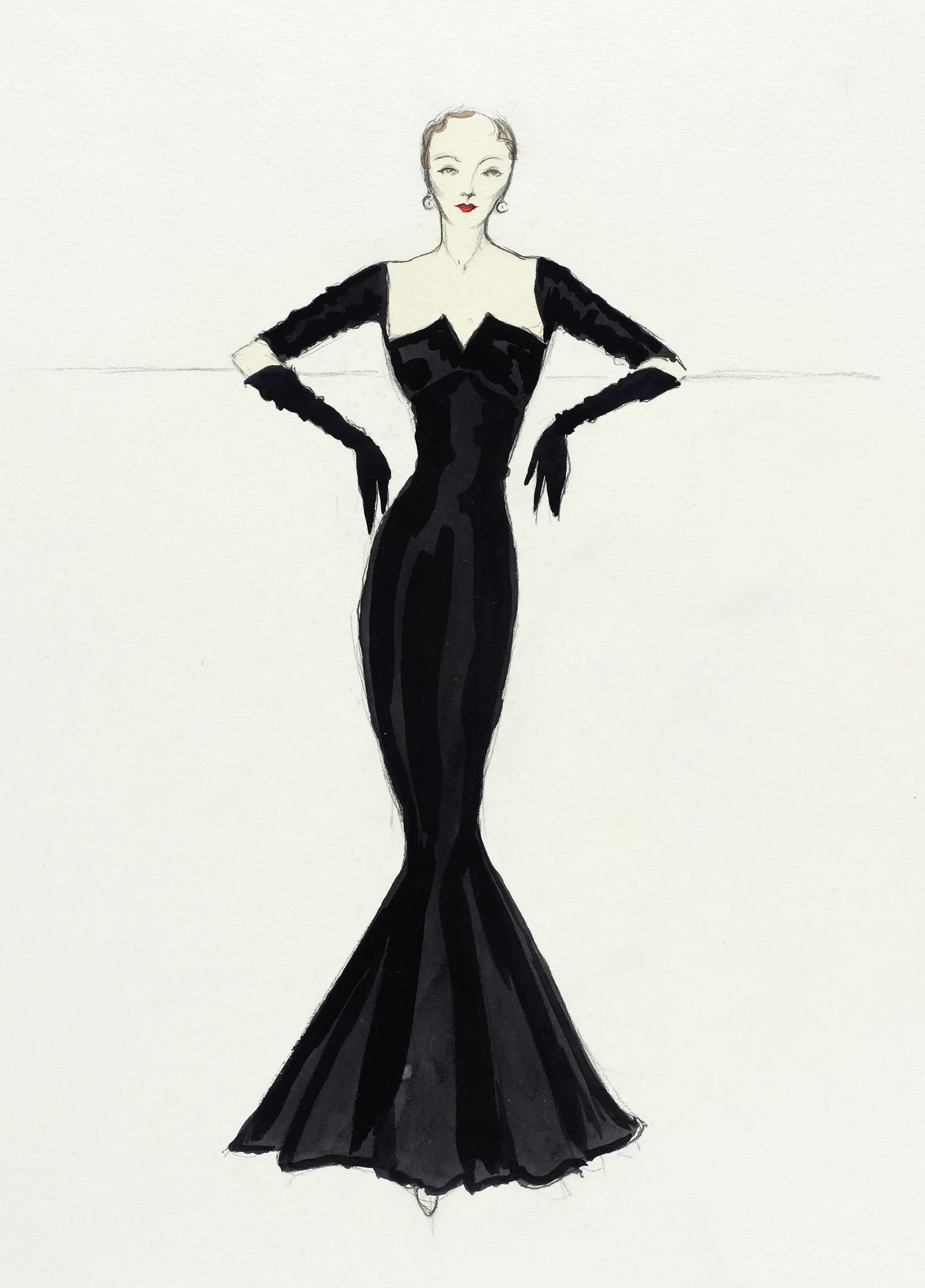 Fashion illustration in black ink and wash with red accents, full-length female figure in a fitted black trumpet-hem gown and long gloves, facing forward