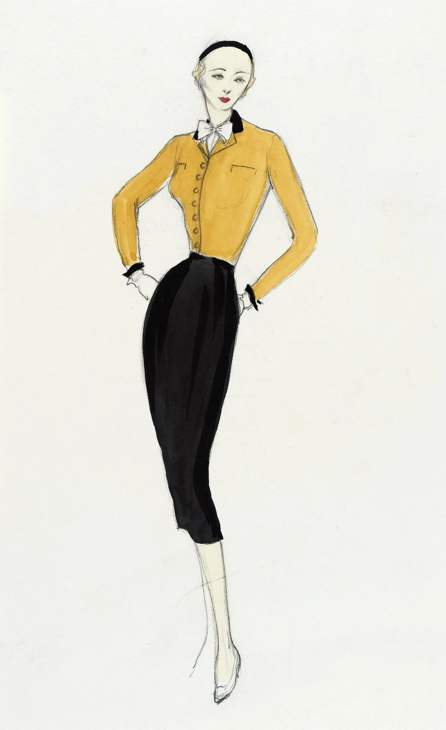 Fashion illustration in ink and wash on white paper, full-length figure in a mustard-yellow fitted jacket with black collar and slim black midi skirt