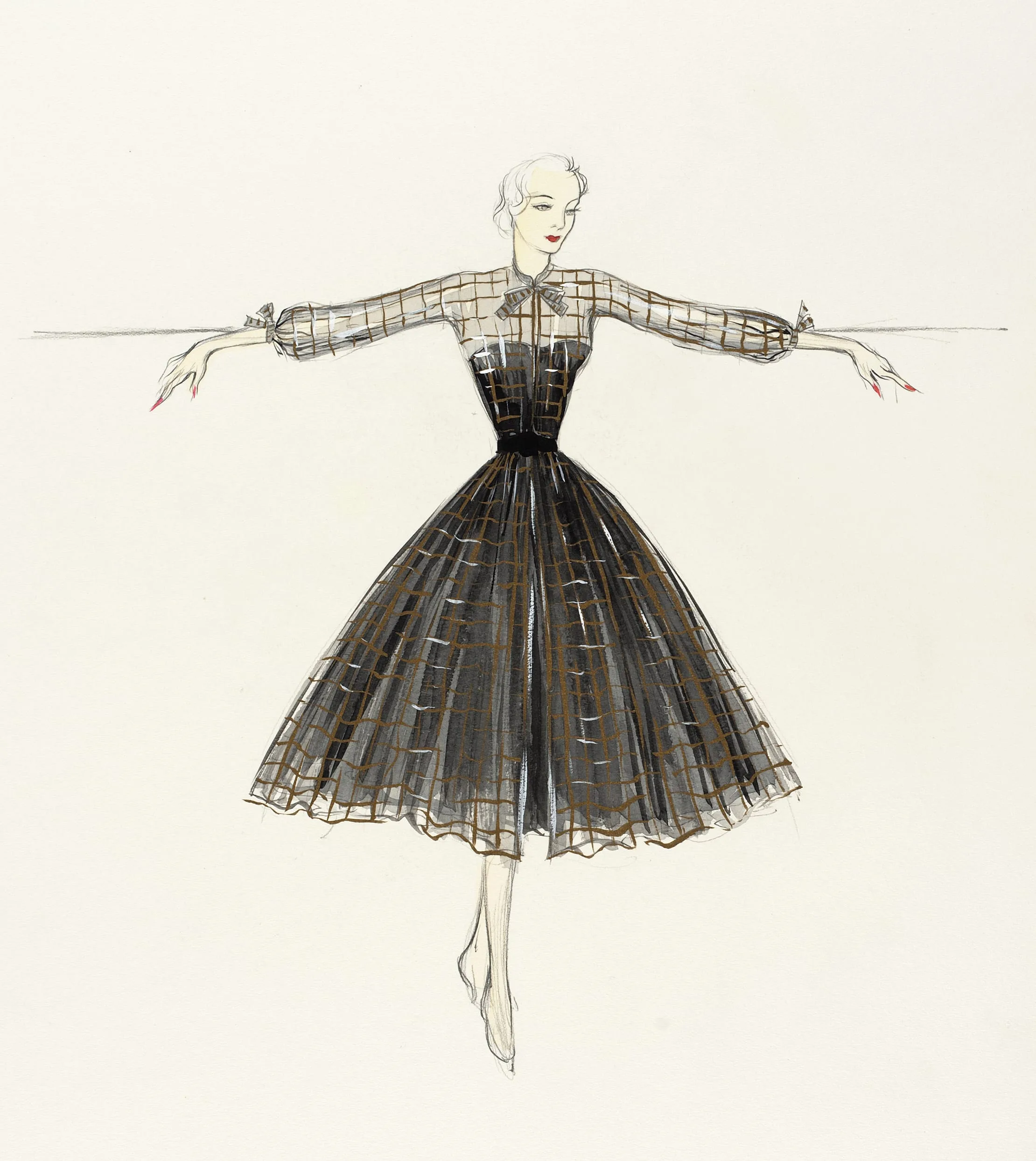 Fashion illustration in ink and wash on cream paper, a woman in a full-skirted grid-patterned dress balances on her toes with arms outstretched along a horizontal barre line