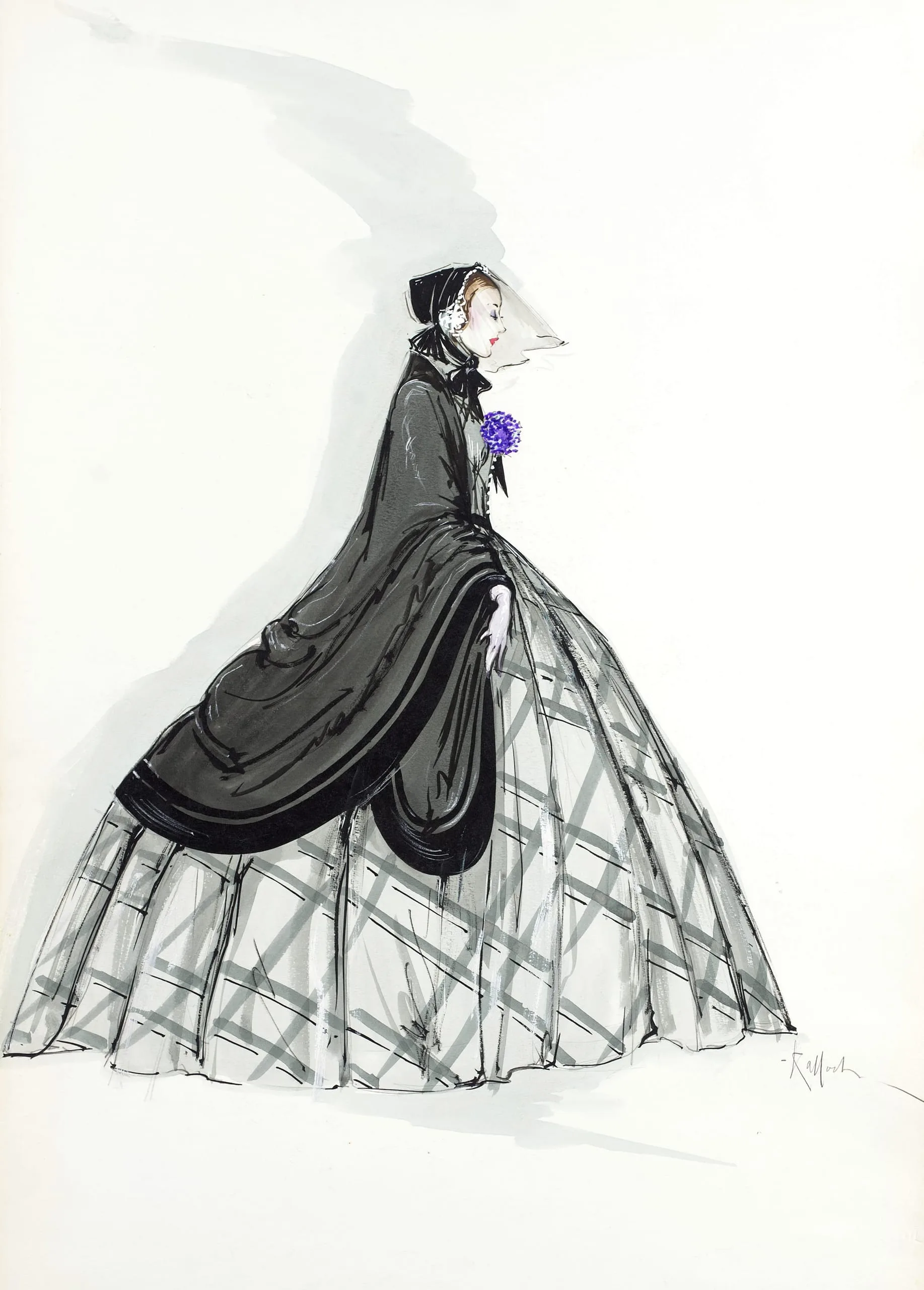 Fashion illustration in black ink and gray wash on white paper, woman in profile wearing a voluminous plaid ballgown and black cape, with a small violet flower at the chest