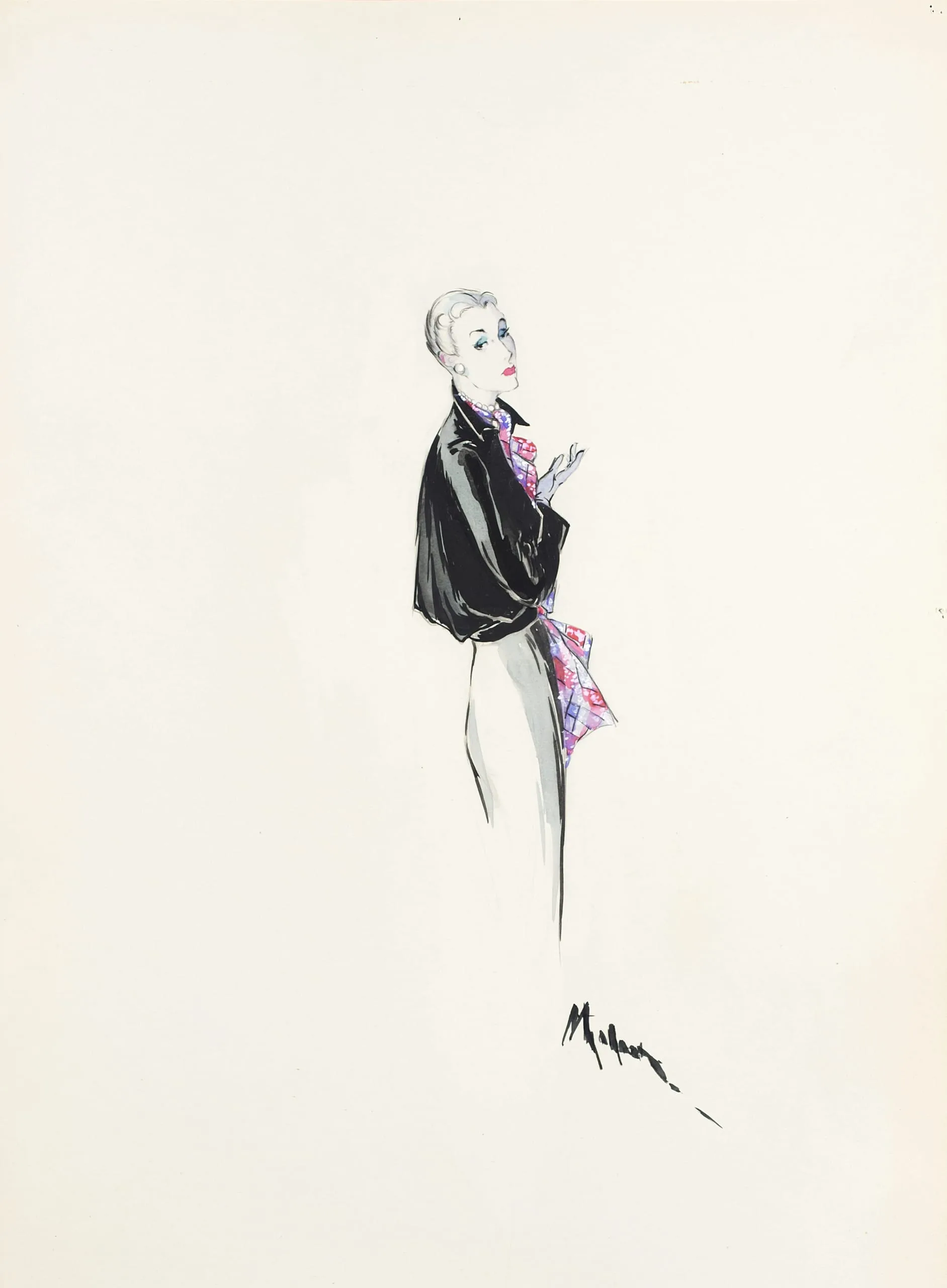 Fashion illustration in ink and color wash on off-white paper, elongated standing figure in a voluminous black jacket with a pink argyle sash, face in three-quarter profile