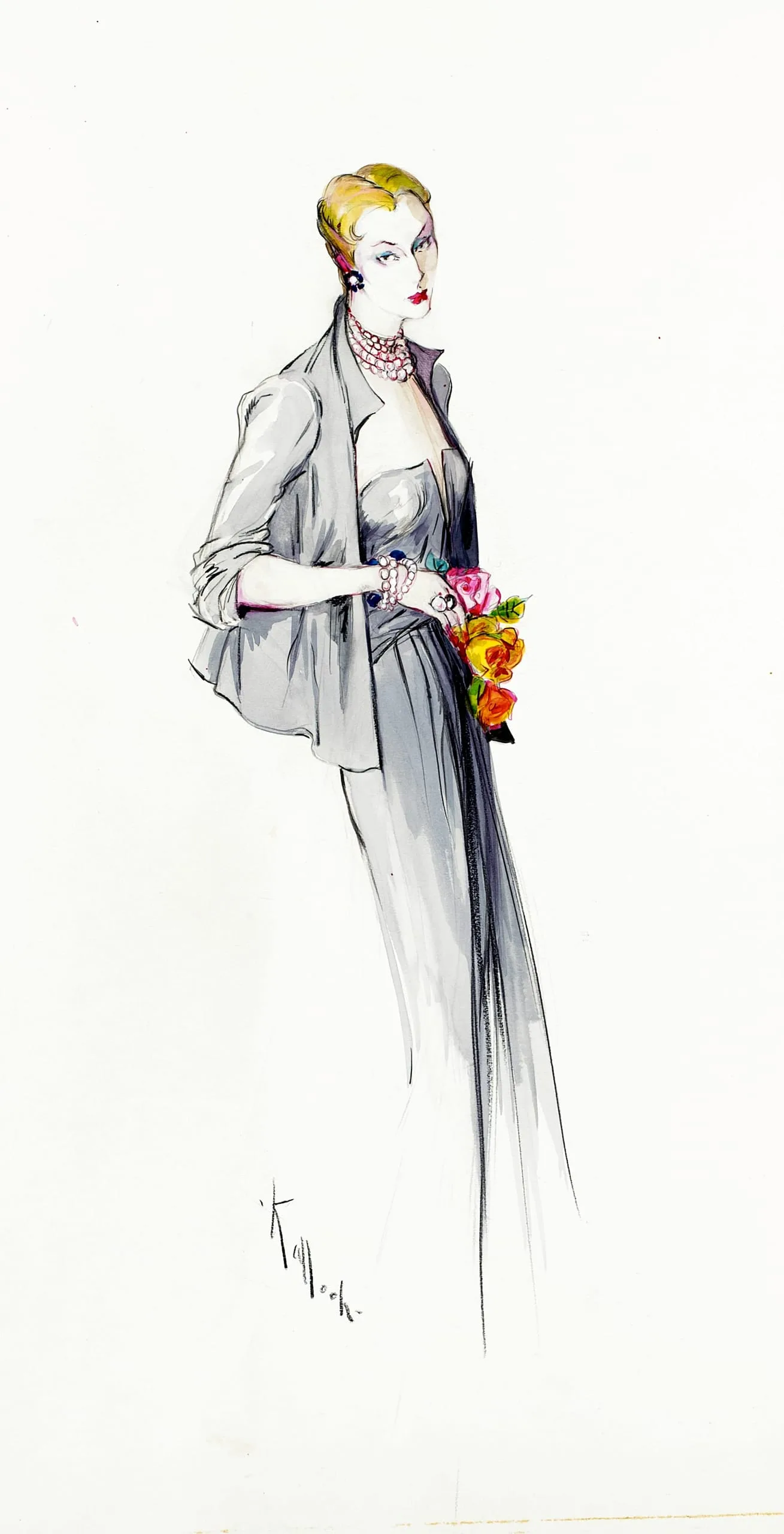 Fashion illustration in ink and watercolor, full-length female figure in a gray strapless gown and open jacket, holding a small bouquet of orange and yellow roses