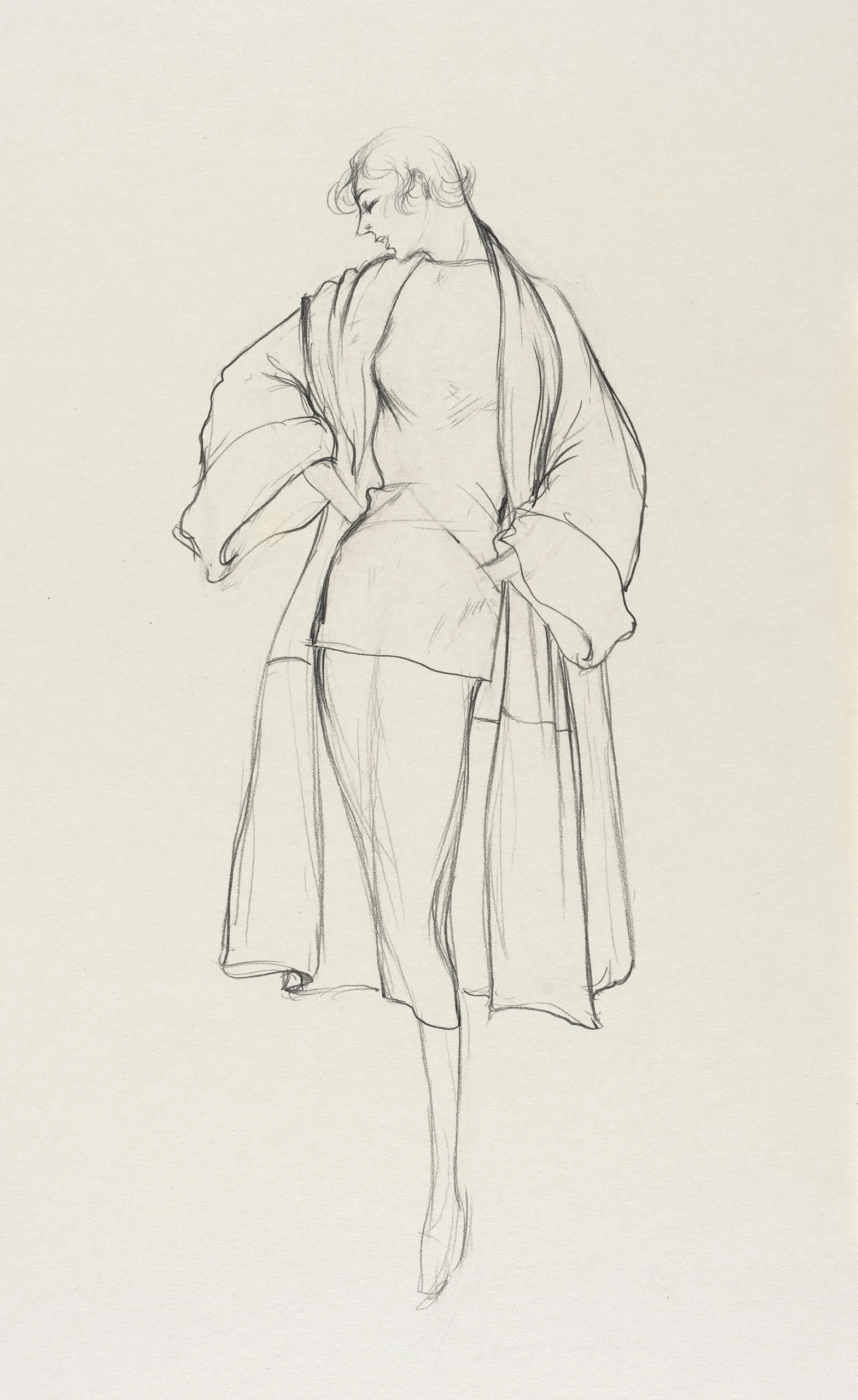 Pencil drawing on cream paper, full-length fashion figure seen from behind, wearing an oversized open coat over a belted top, rendered in loose gestural strokes