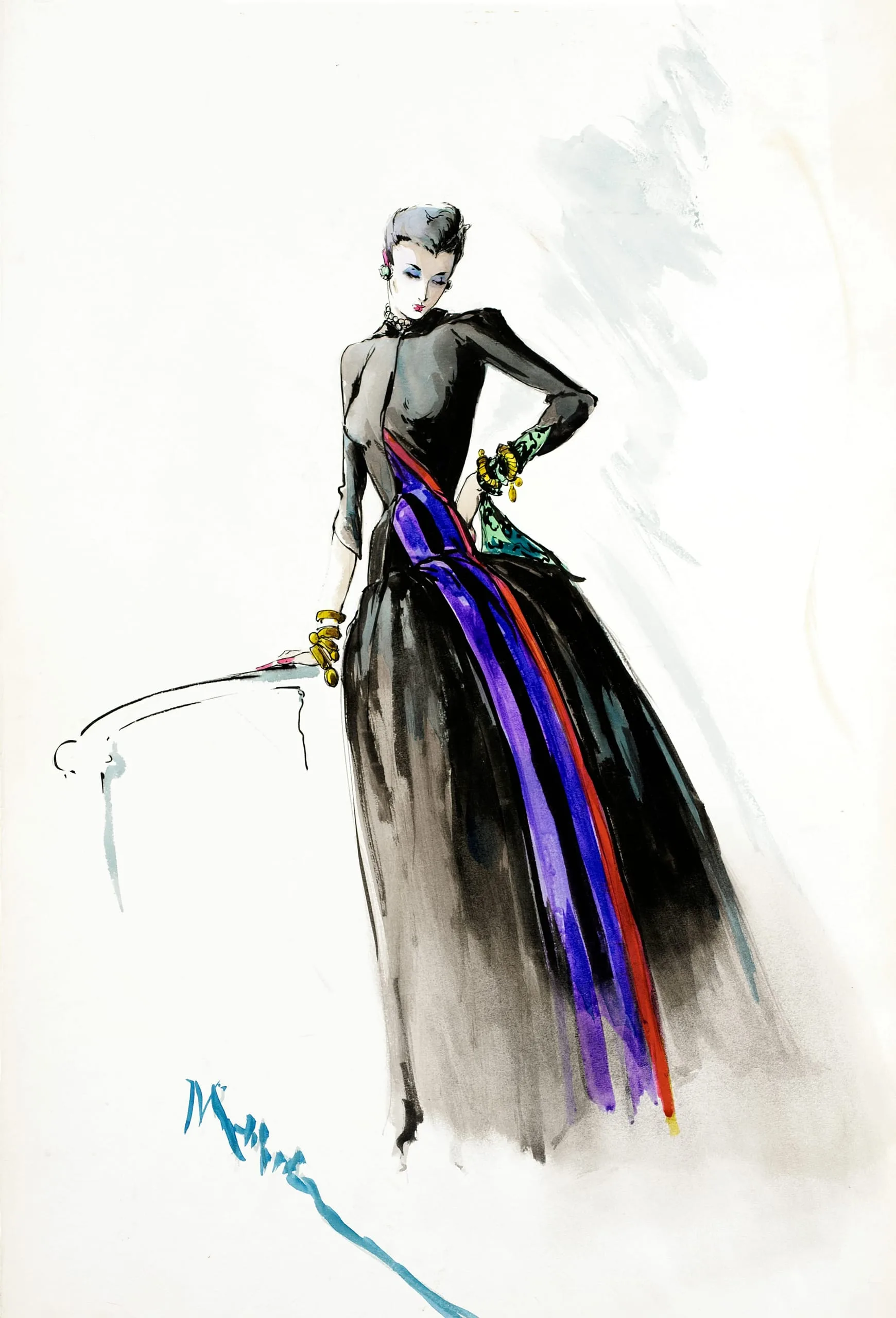 Fashion illustration in ink and watercolor of a woman in a black floor-length gown with bold violet, red, and teal diagonal stripes on the skirt, holding a riding crop