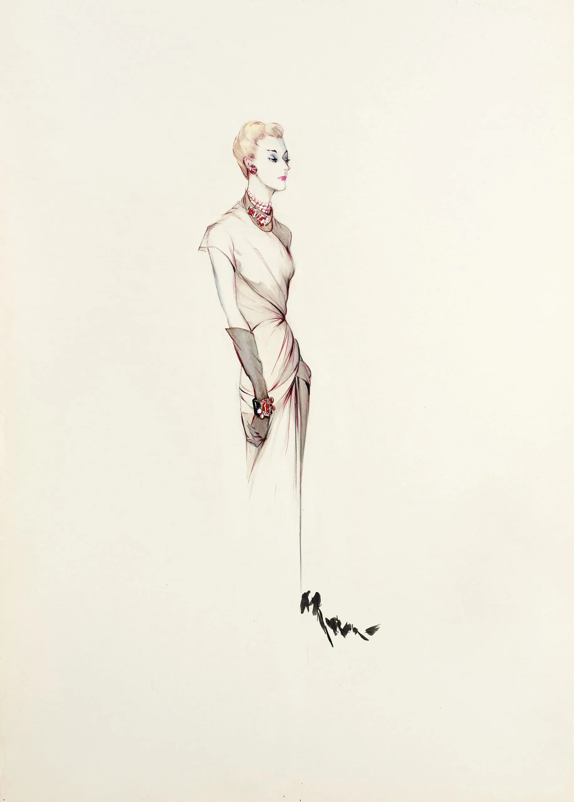 Fashion illustration in graphite and watercolor on cream paper, full-length female figure in profile wearing a draped dress, long gloves, and red jewelry