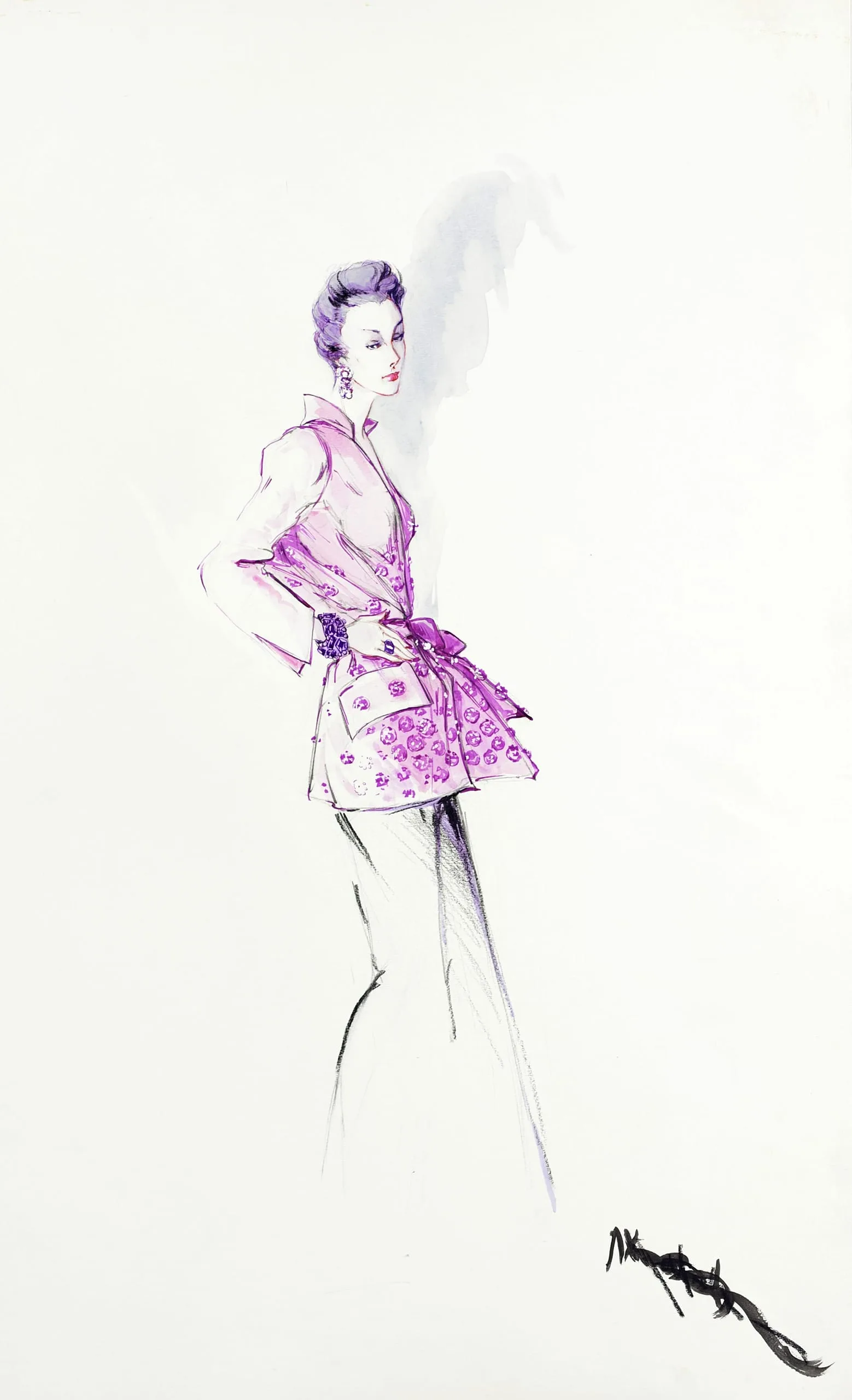Fashion illustration in magenta ink and pencil on white paper, full-length figure in a floral-patterned belted jacket, facing away with head turned back over shoulder