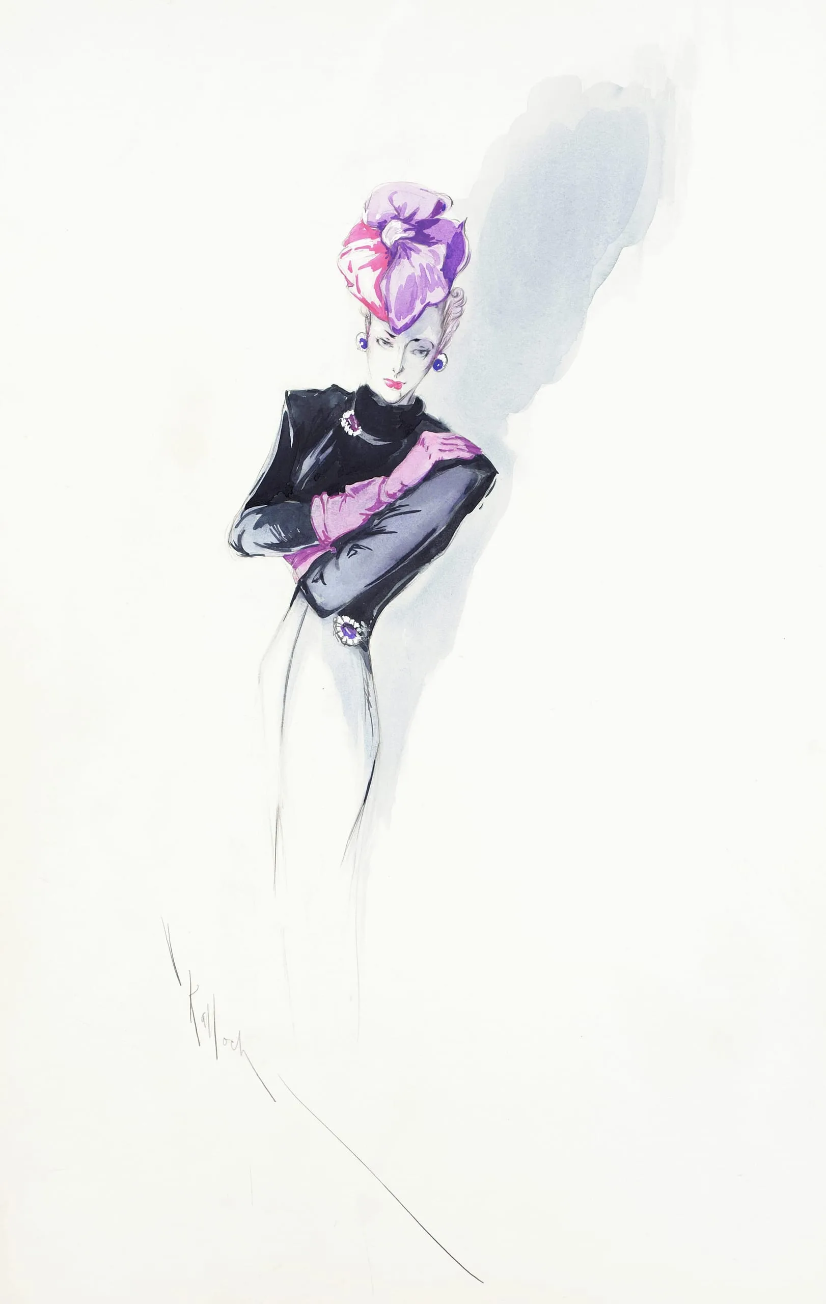 Fashion illustration in ink and watercolor on white paper, full-length figure of a woman in a black jacket with fuchsia shoulders and a towering pink and purple hat, upper body detailed and lower body dissolving into loose graphite lines
