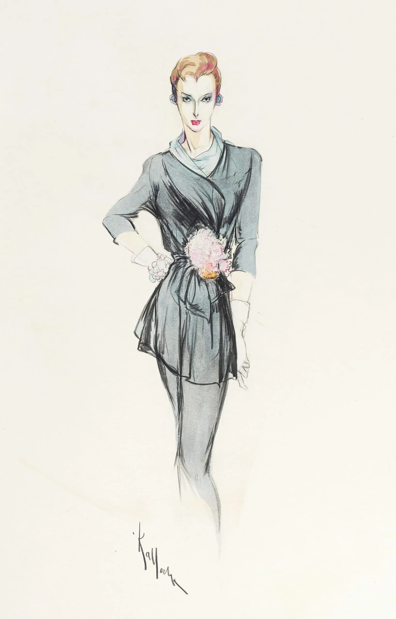 Fashion illustration in ink and watercolor on cream paper, full-length standing woman in a slate-blue wrap dress with a pink floral waist accent and white gloves