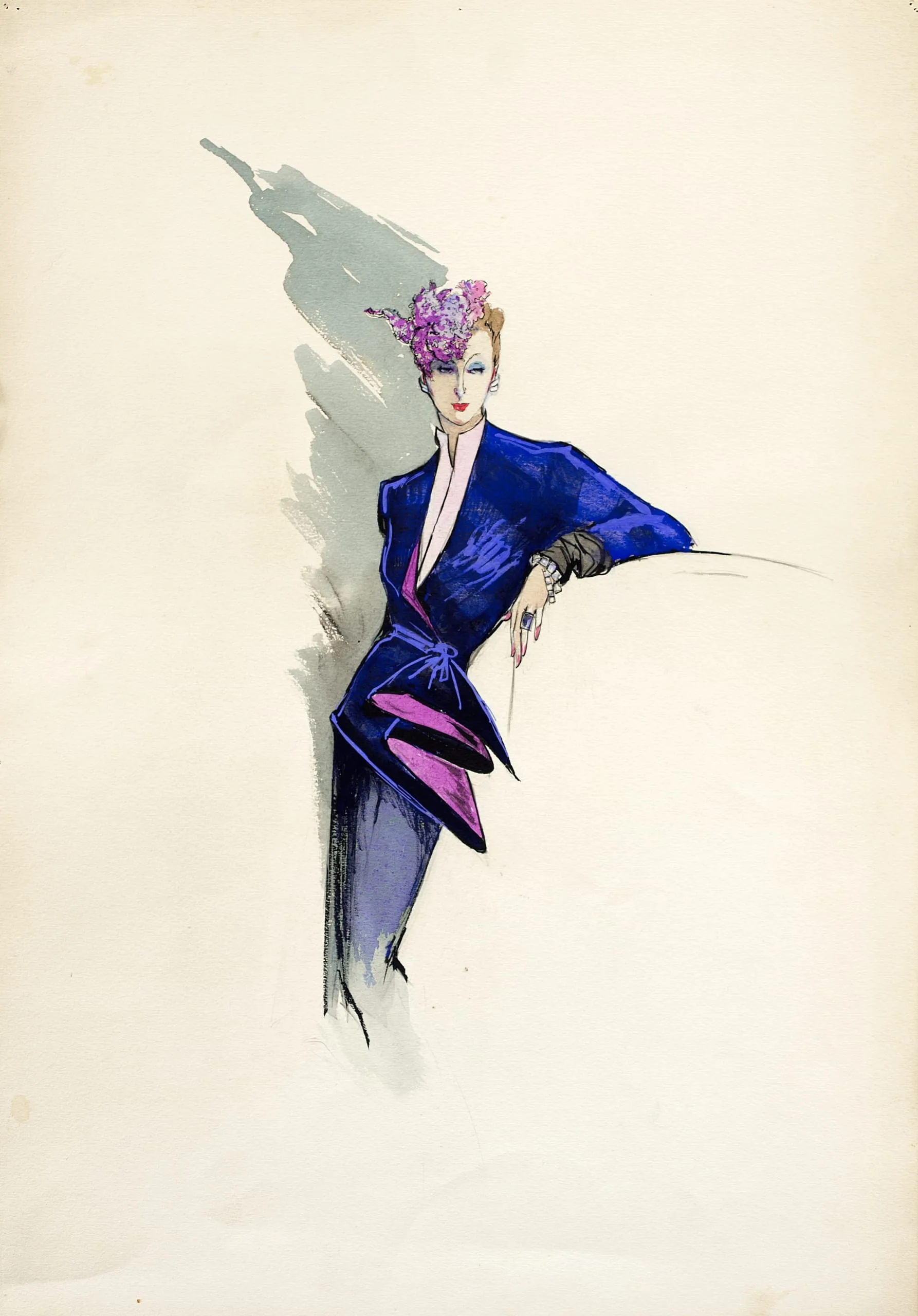 Watercolor and ink fashion illustration on cream paper, full-length female figure in a cobalt blue jacket with magenta trim and a floral headpiece, rendered with fluid gestural lines