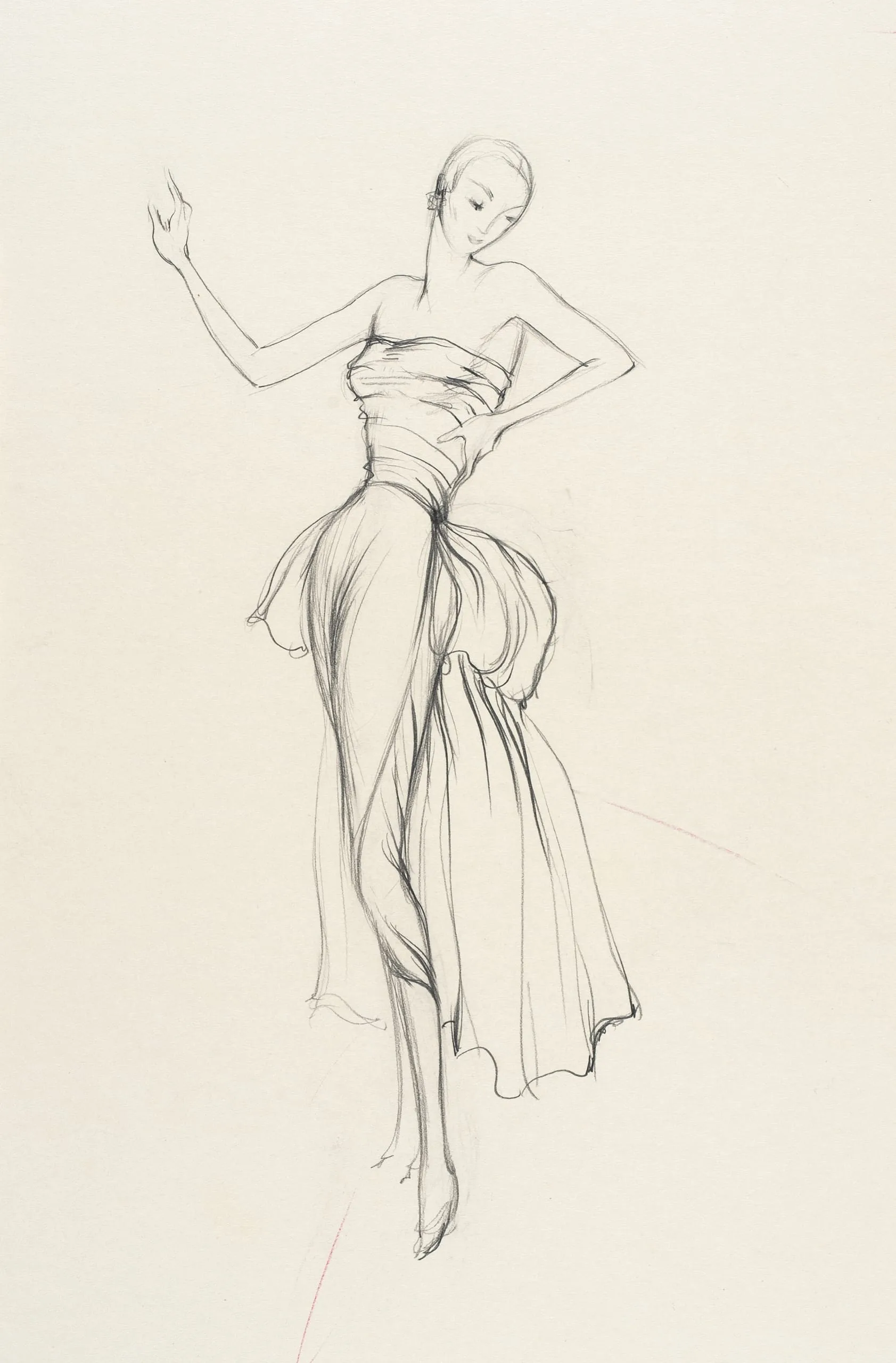 Graphite fashion sketch on cream paper, full-length female figure in a draped strapless dress with a billowing skirt, arms extended, drawn with loose expressive lines