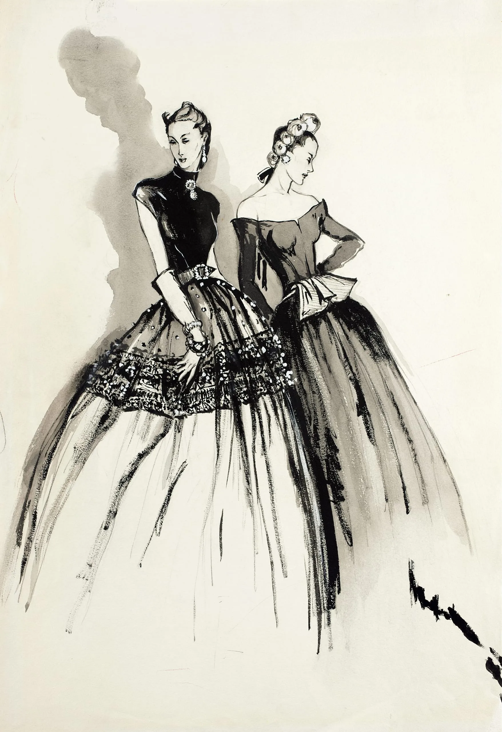 Fashion illustration in black ink and gray wash on cream paper, two stylized figures in full-skirted ball gowns with bold, loose brushwork