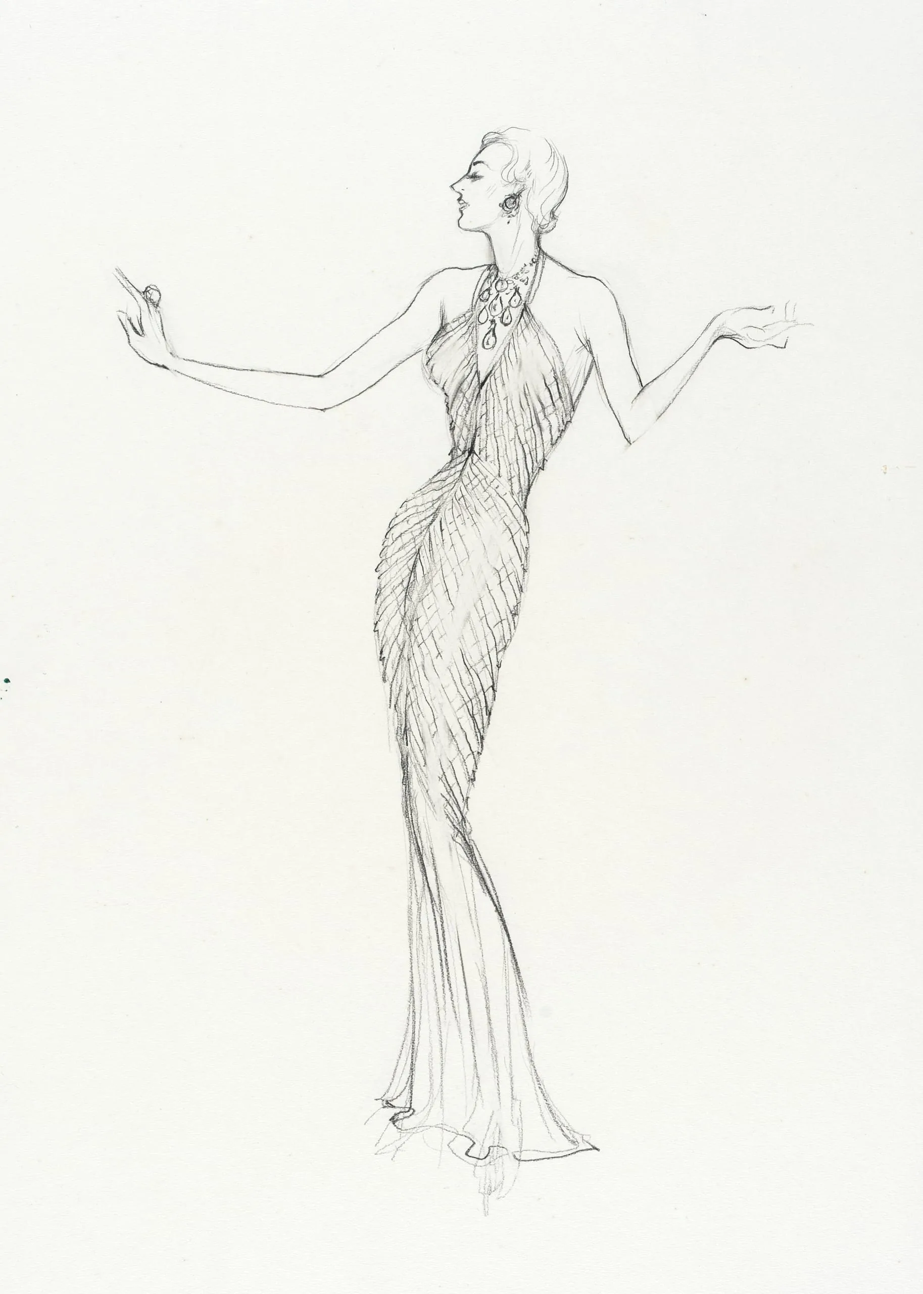 Graphite fashion illustration on cream paper, full-length female figure in profile wearing a floor-length halter gown with diagonal hatching, arms extended outward