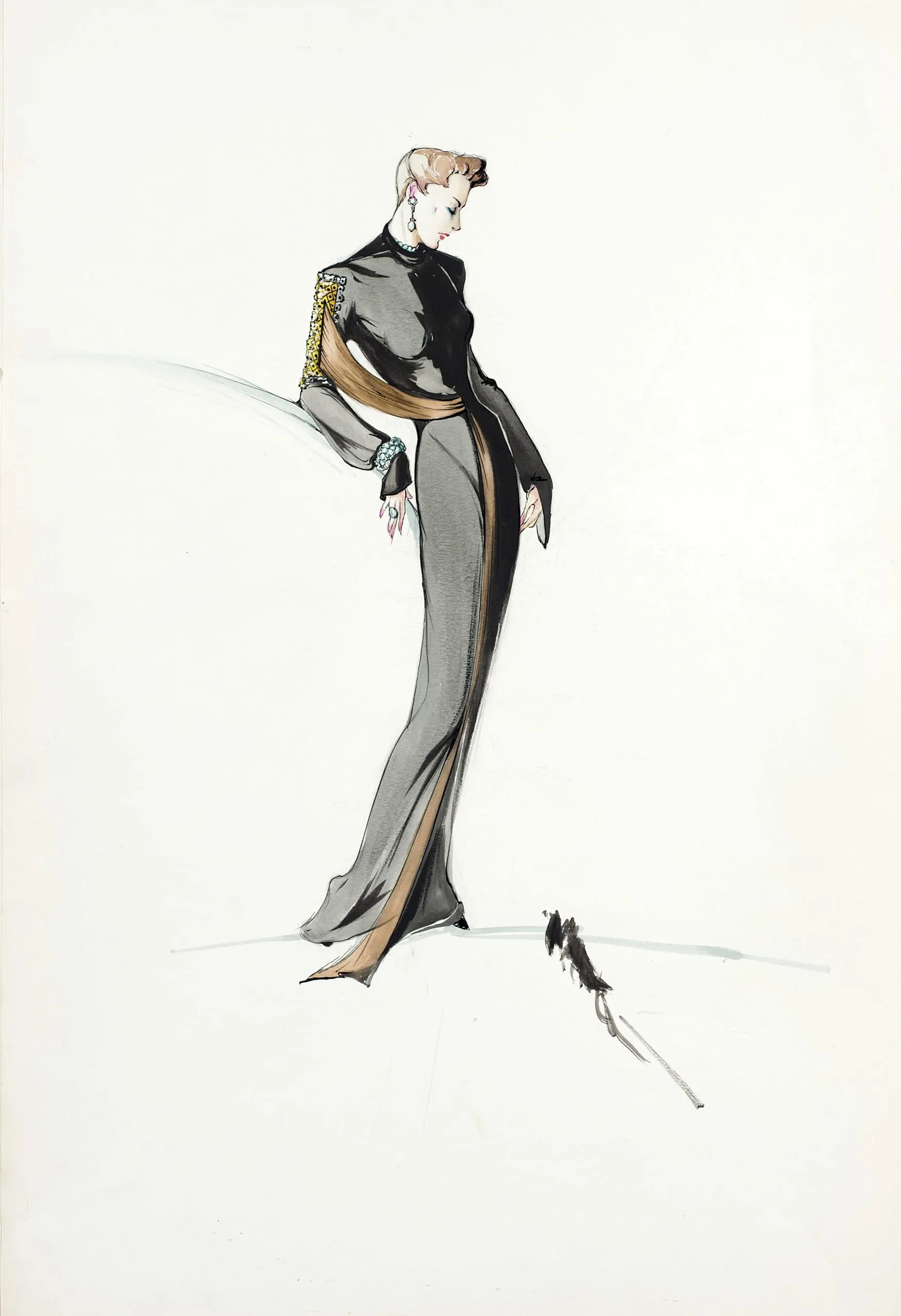 Fashion illustration in ink and wash on white paper, full-length figure in profile wearing a floor-length black and gray gown with a golden diagonal sash and jeweled cuff