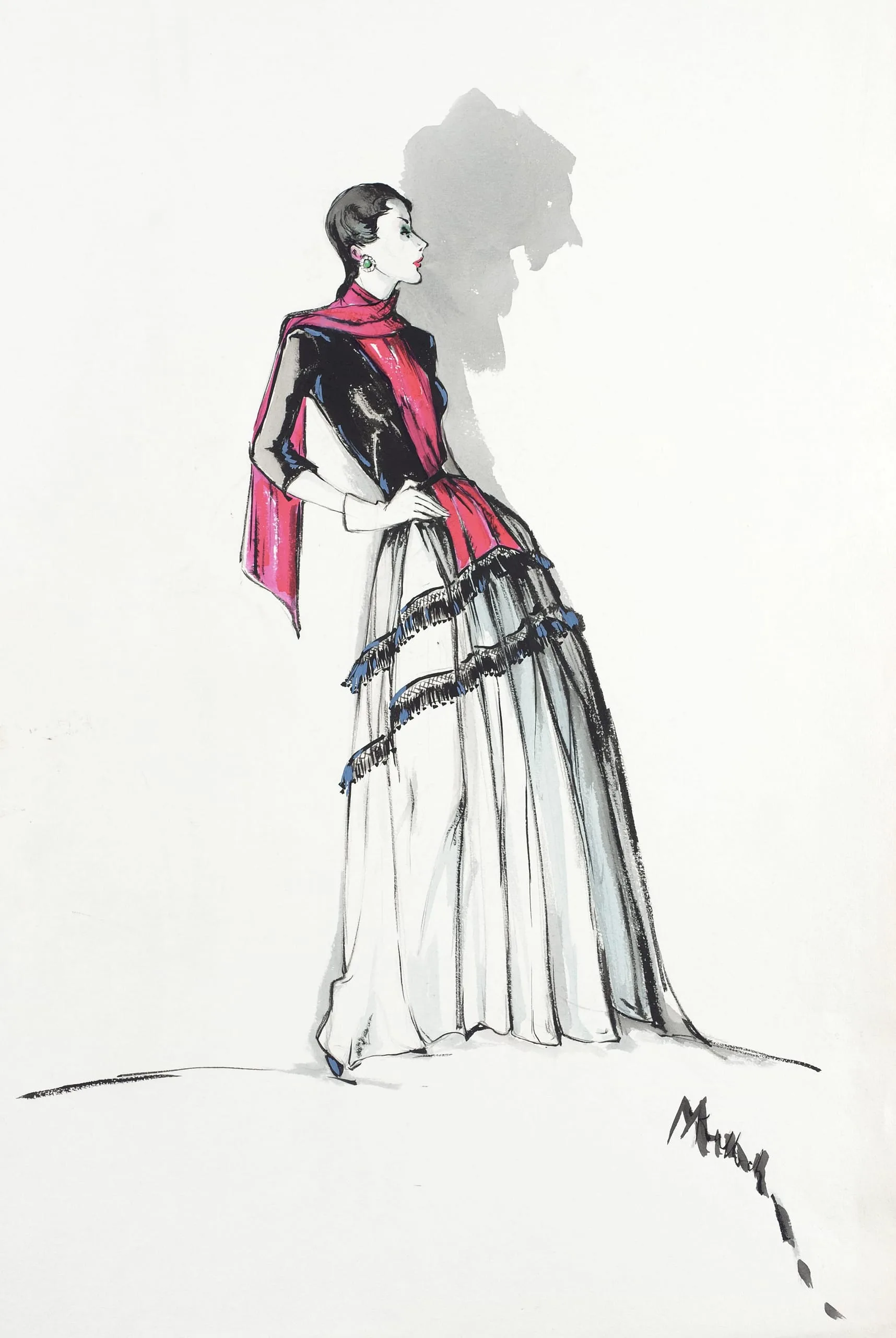 Fashion illustration in ink and marker on white paper, full-length figure in profile wearing a white pleated skirt with fringed tiers, navy bodice, and crimson red draped scarf