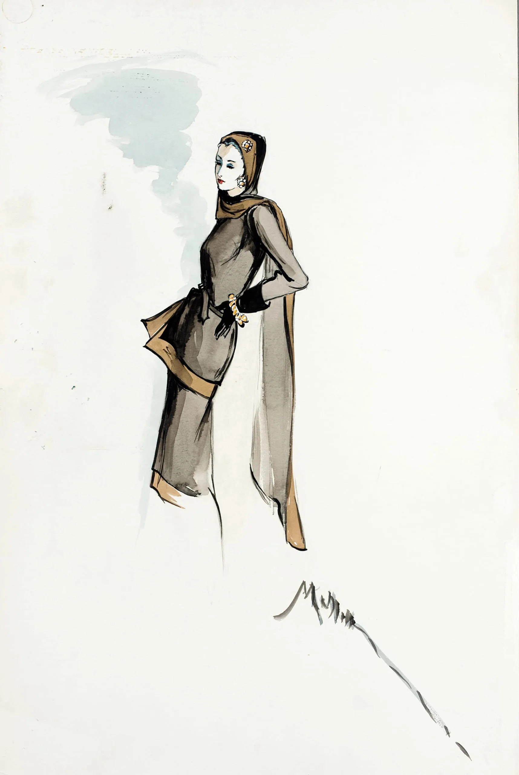 Fashion illustration in ink and wash on white paper, full-length female figure in hooded tan coat over wide-leg trousers, rendered in loose, fluid strokes