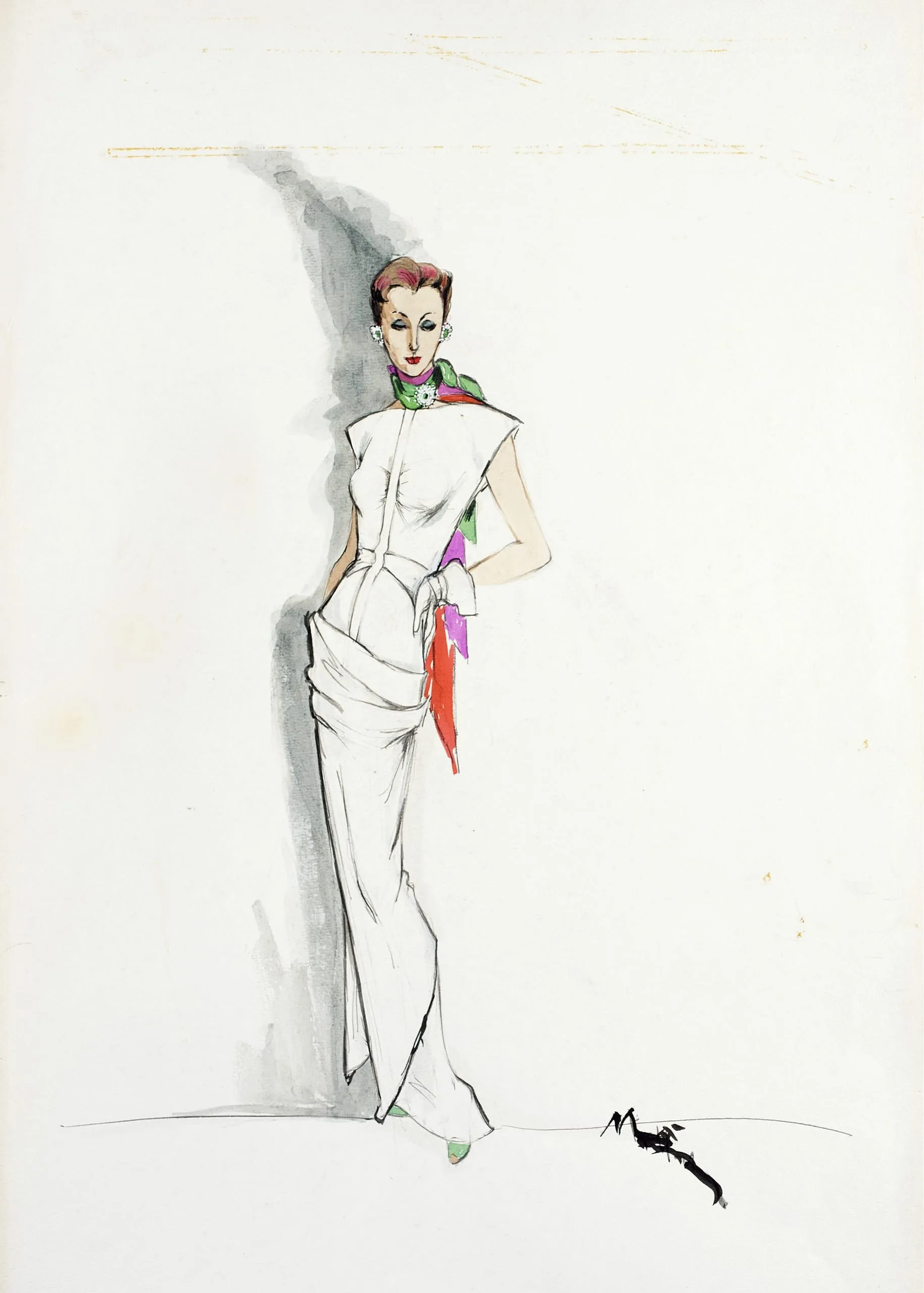 Fashion illustration in ink, watercolor, and gray wash of a full-length female figure in a white sleeveless gown with a colorful pink, green, and orange silk scarf at the hip