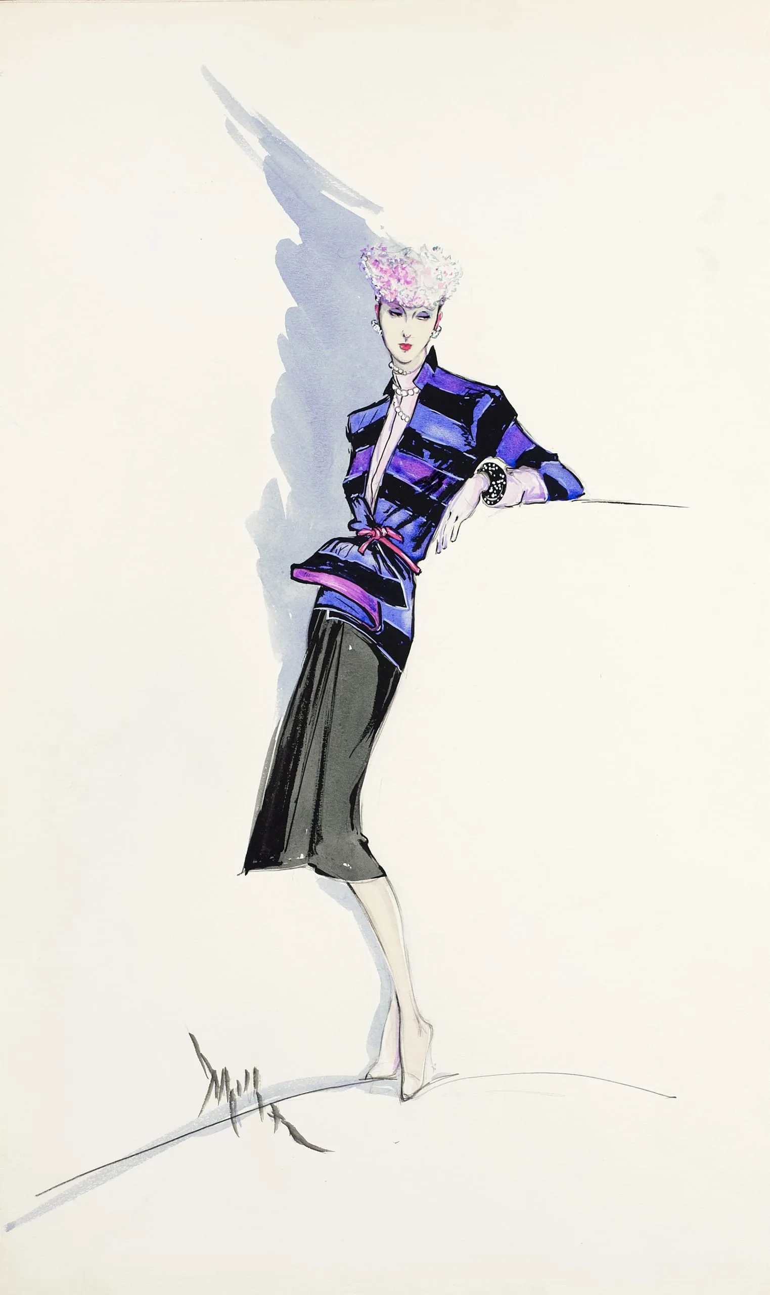Fashion illustration in ink and marker of an elongated female figure in a cobalt blue striped jacket, fuchsia sash, and black skirt, with pink hair, on white paper