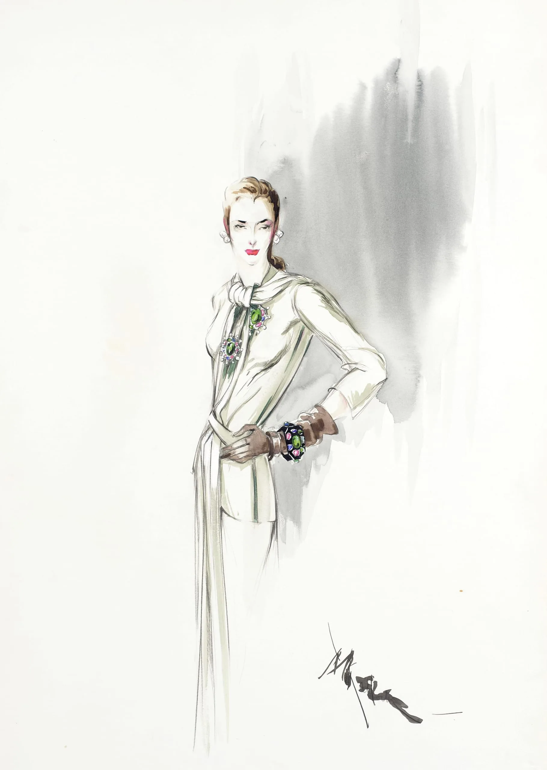 Fashion illustration in ink and watercolor of a full-length female figure in a cream-white ensemble with a long draped scarf, gemstone brooch, and jeweled cuff bracelet, against a gray wash background
