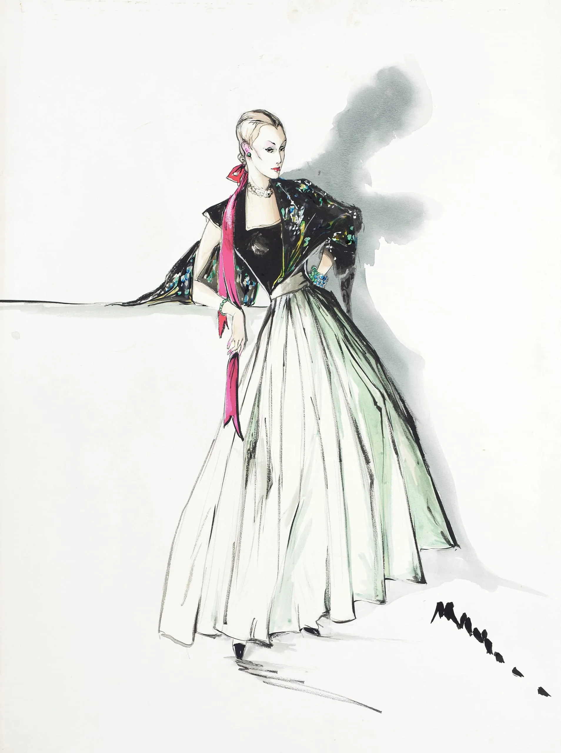 Fashion illustration in ink and watercolor, full-length figure of a woman in a full white skirt and dark floral jacket with a pink ribbon in her hair