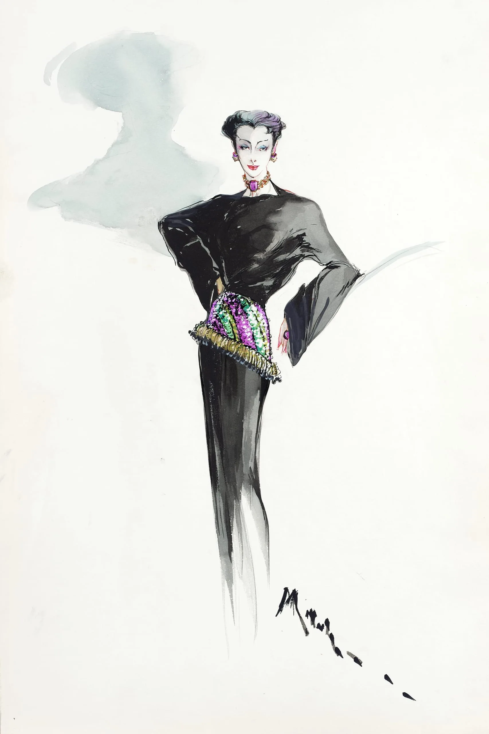 Fashion illustration in black ink and gray wash with watercolor, full-length female figure in a black long-sleeved gown with a colorful beaded belt in purple, green, and gold