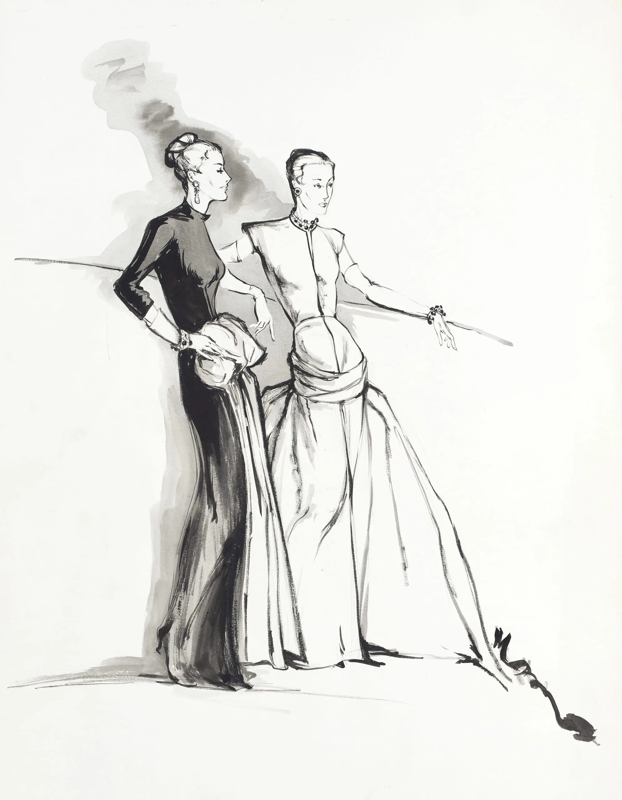 Fashion illustration in black ink and gray wash, two elongated female figures in floor-length gowns, loose gestural linework on white paper