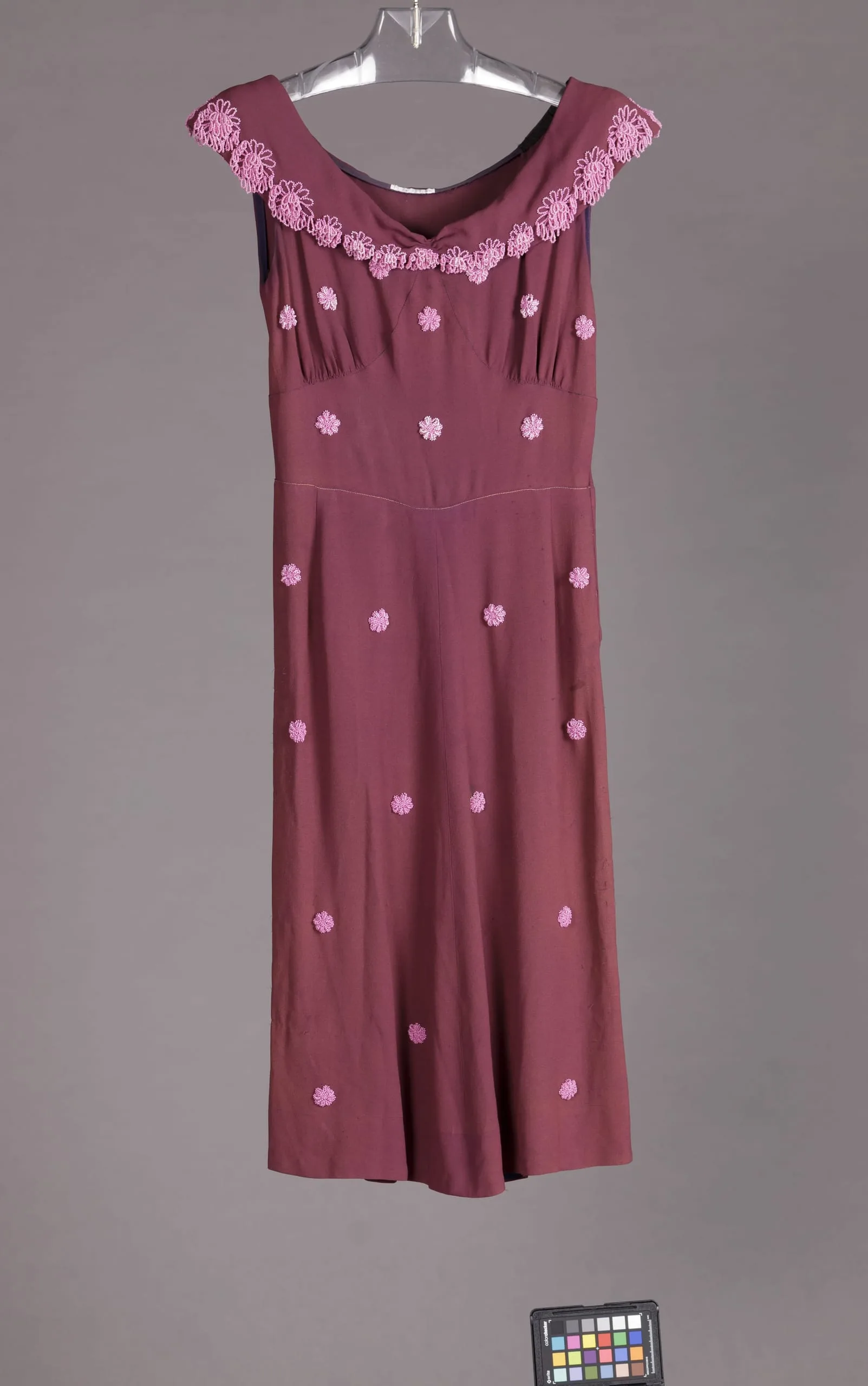 - Dress: Rayon plain weave (crepe), glass beads. Belt: Rayon plain weave (crepe)