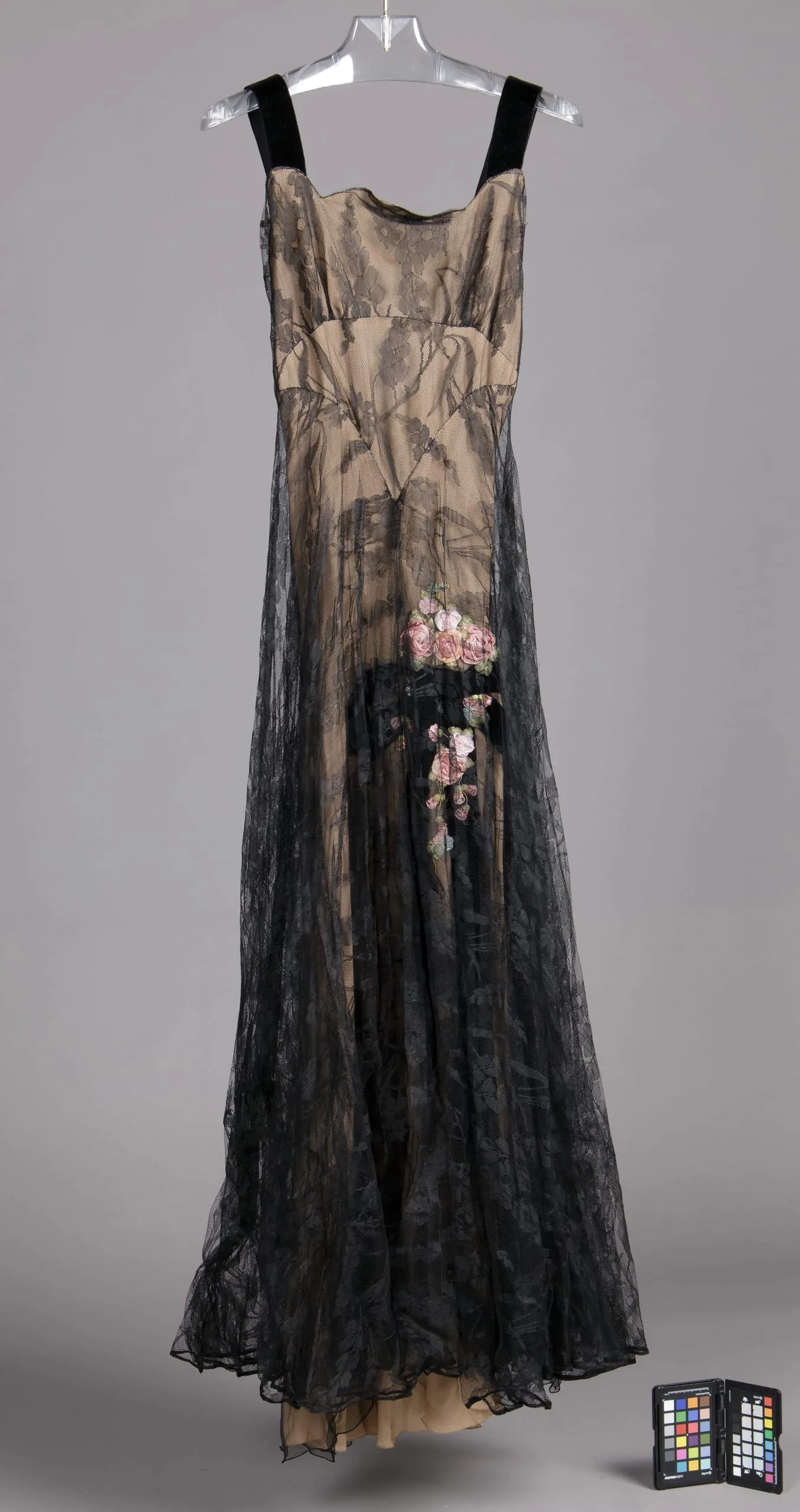 - Silk lace, silk gauze, and silk plain weave (crepe chiffon) with silk velvet ribbons and silk plain weave ribbon