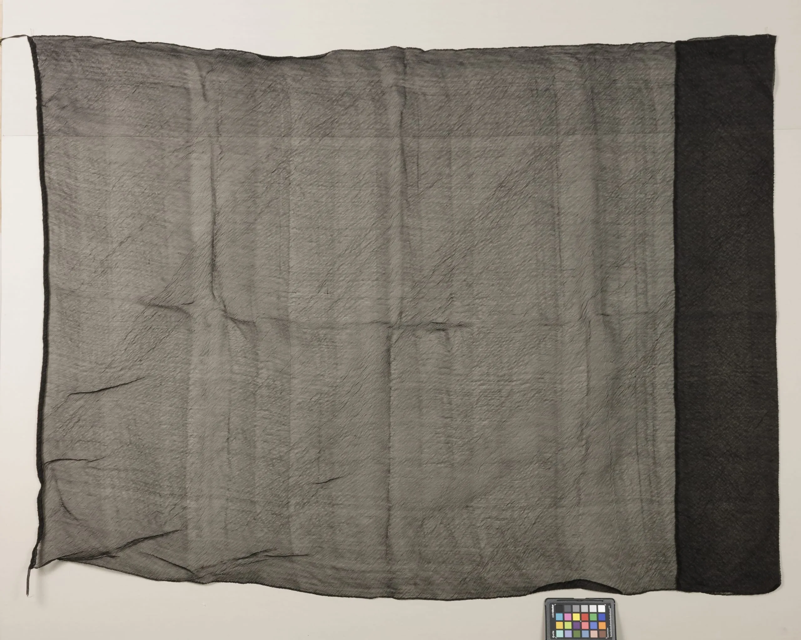 Large rectangular textile with a semi-sheer, smoky gray woven body and a wide, dense near-black panel along the right edge, displayed flat against a white wall