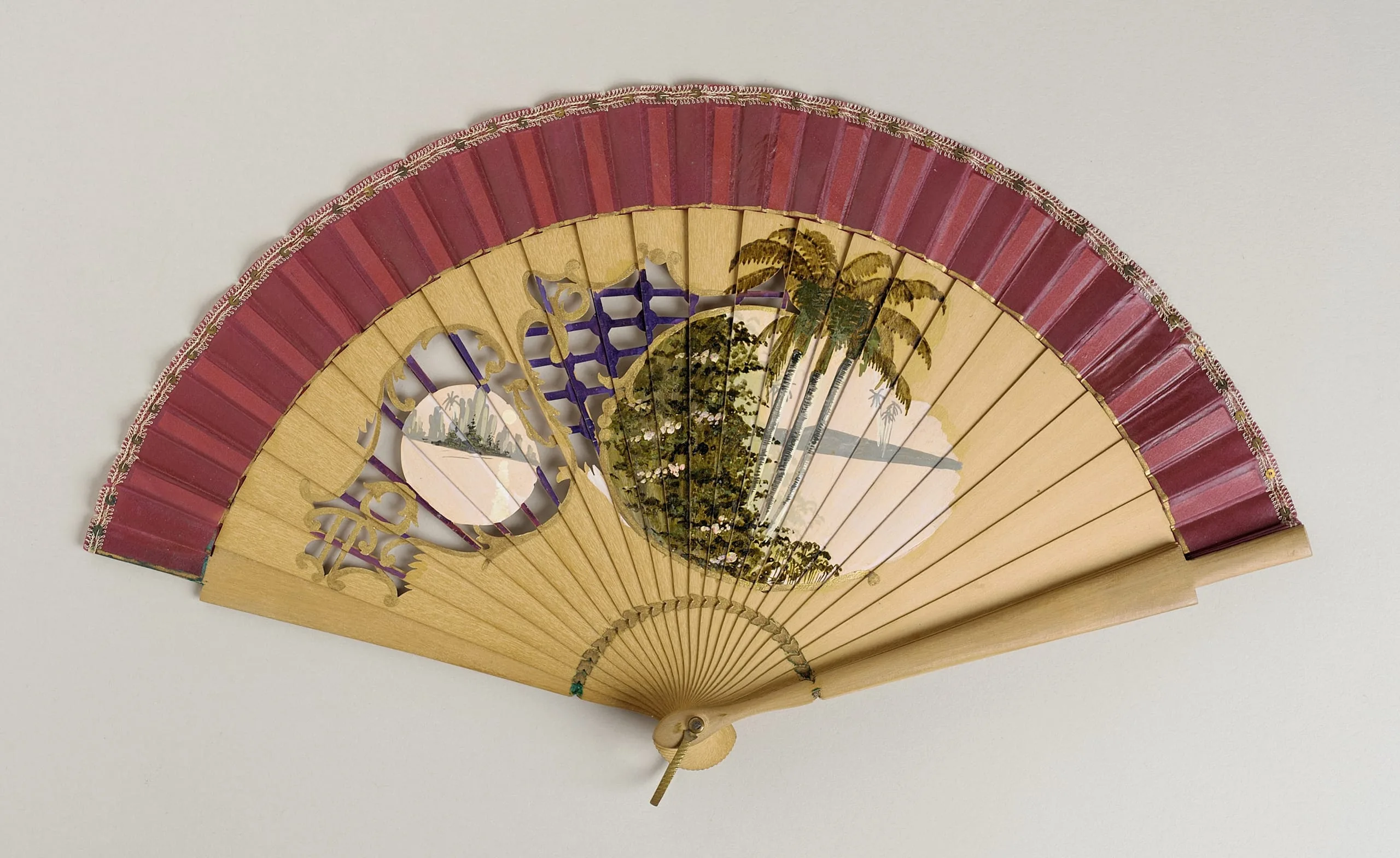 - Chintz leaf, wood sticks, brass metallic loop and button, silver metallic rivet