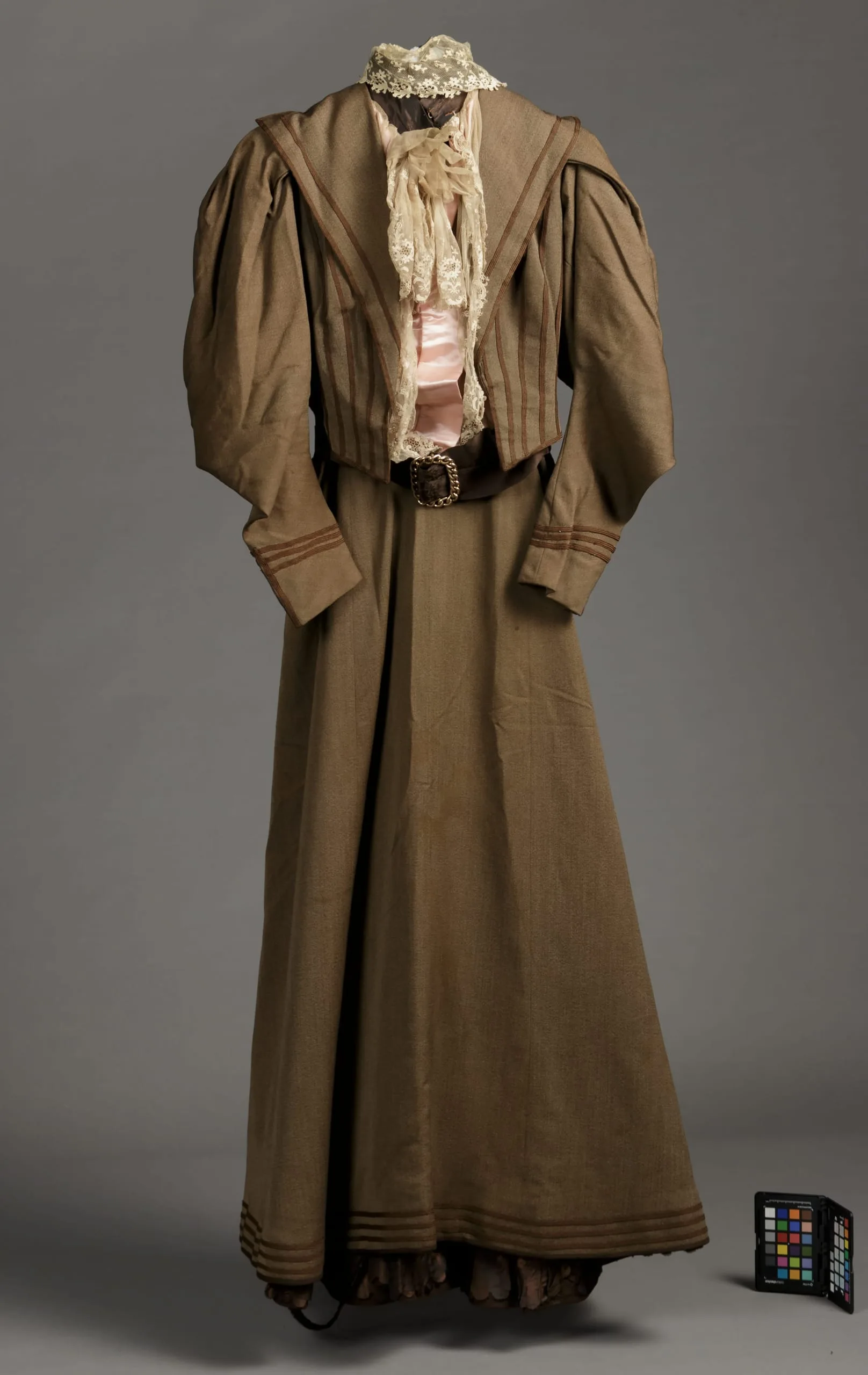 - a) wool and silk twill (serge), silk satin, linen lace, with wool braid, and metal buckle