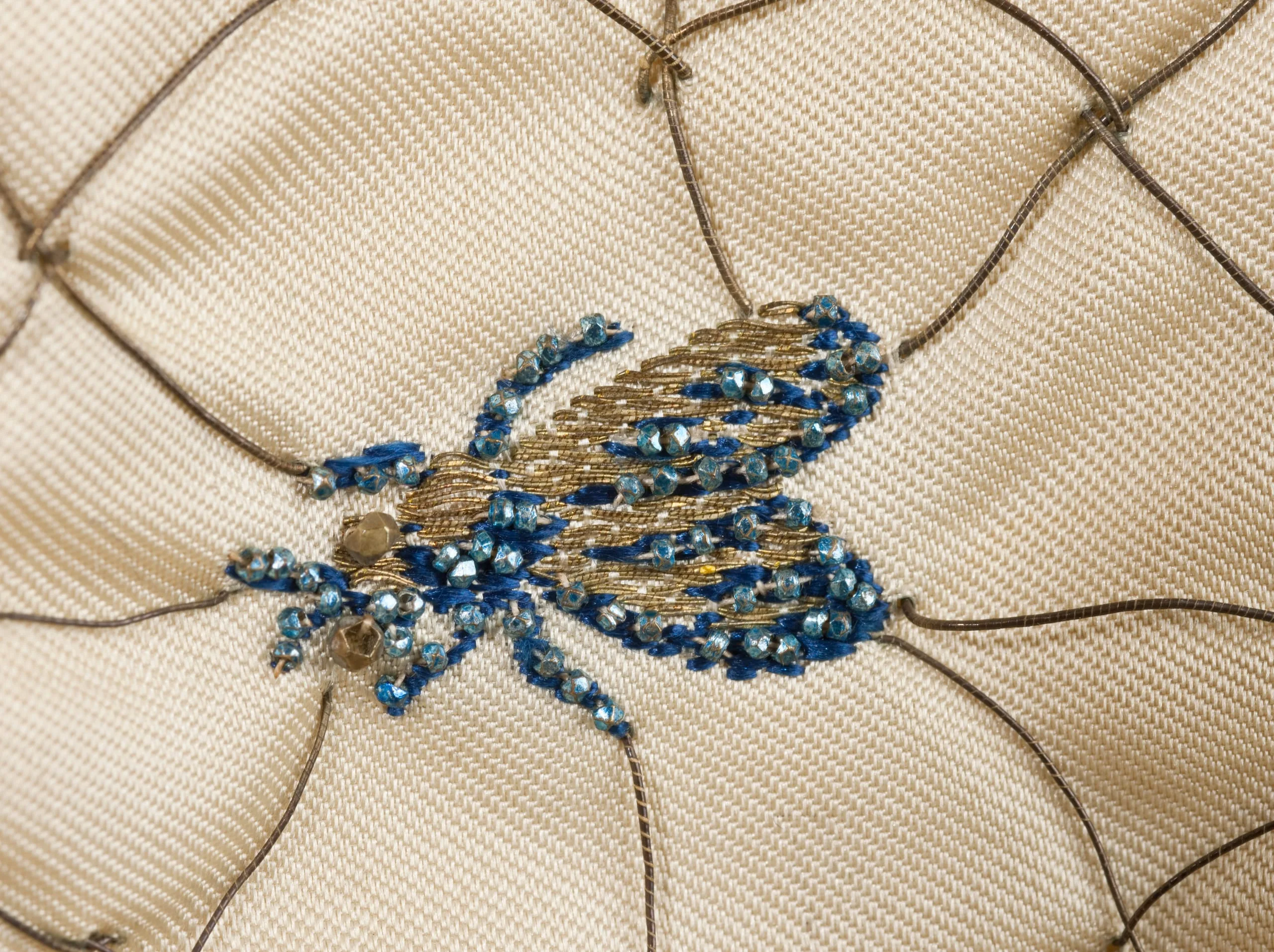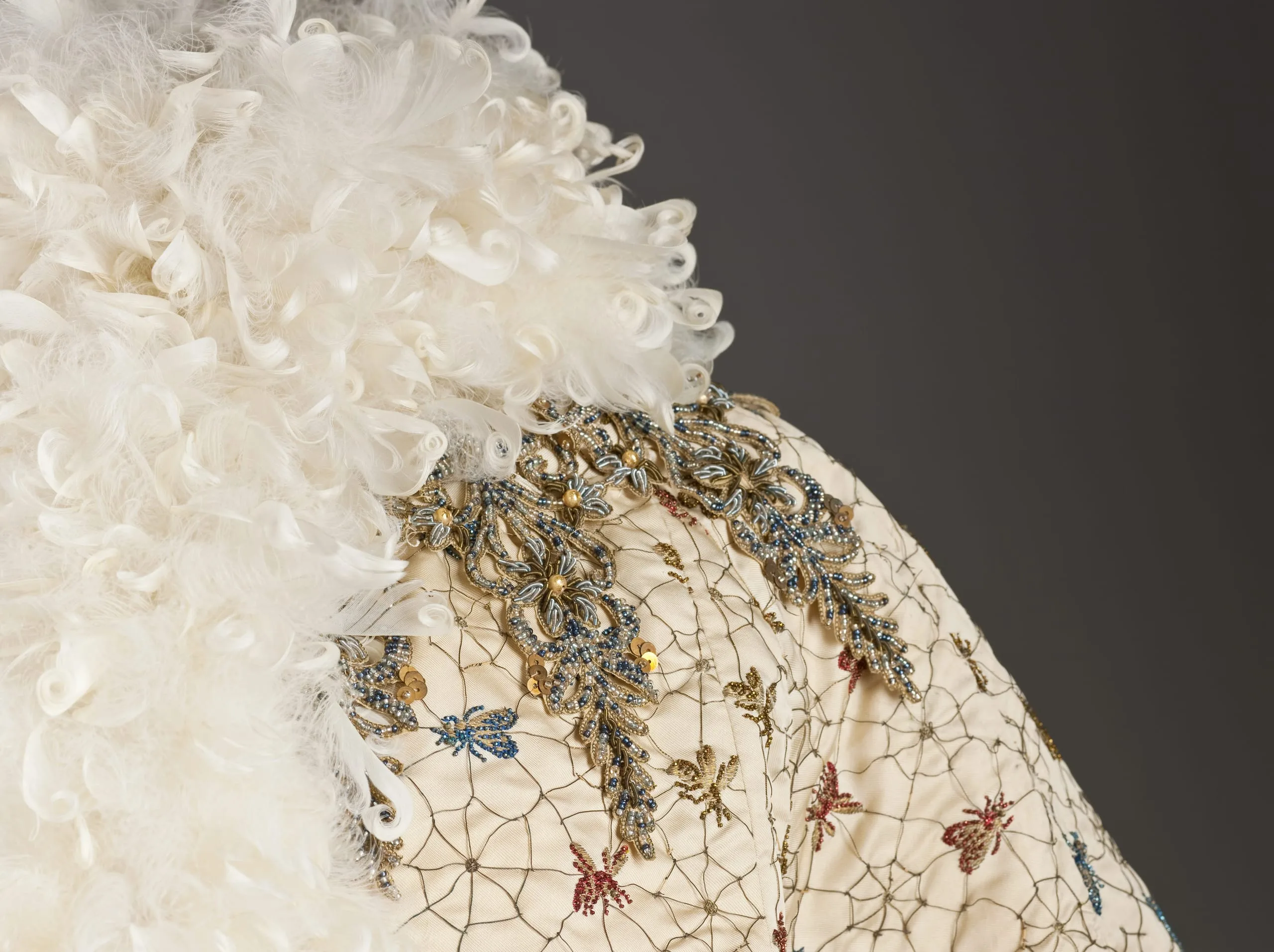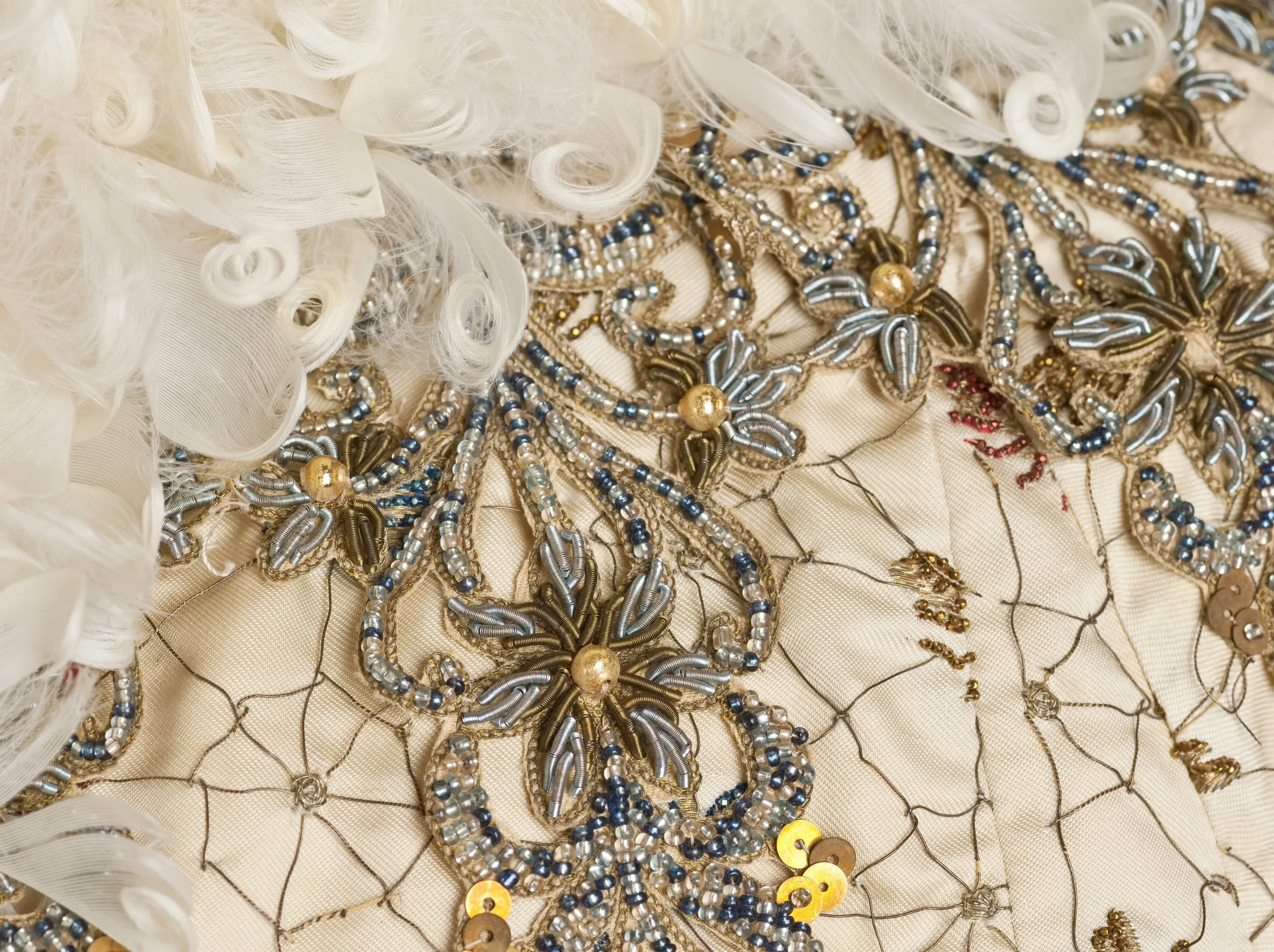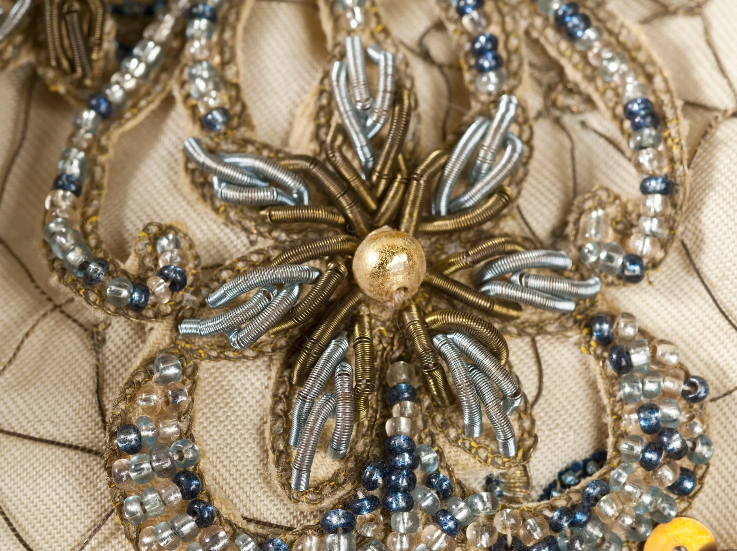 - Silk twill with metallic-thread supplementary weft patterning, glass beads, metal beads, metal sequins, metallic-thread embroidery, and feathers