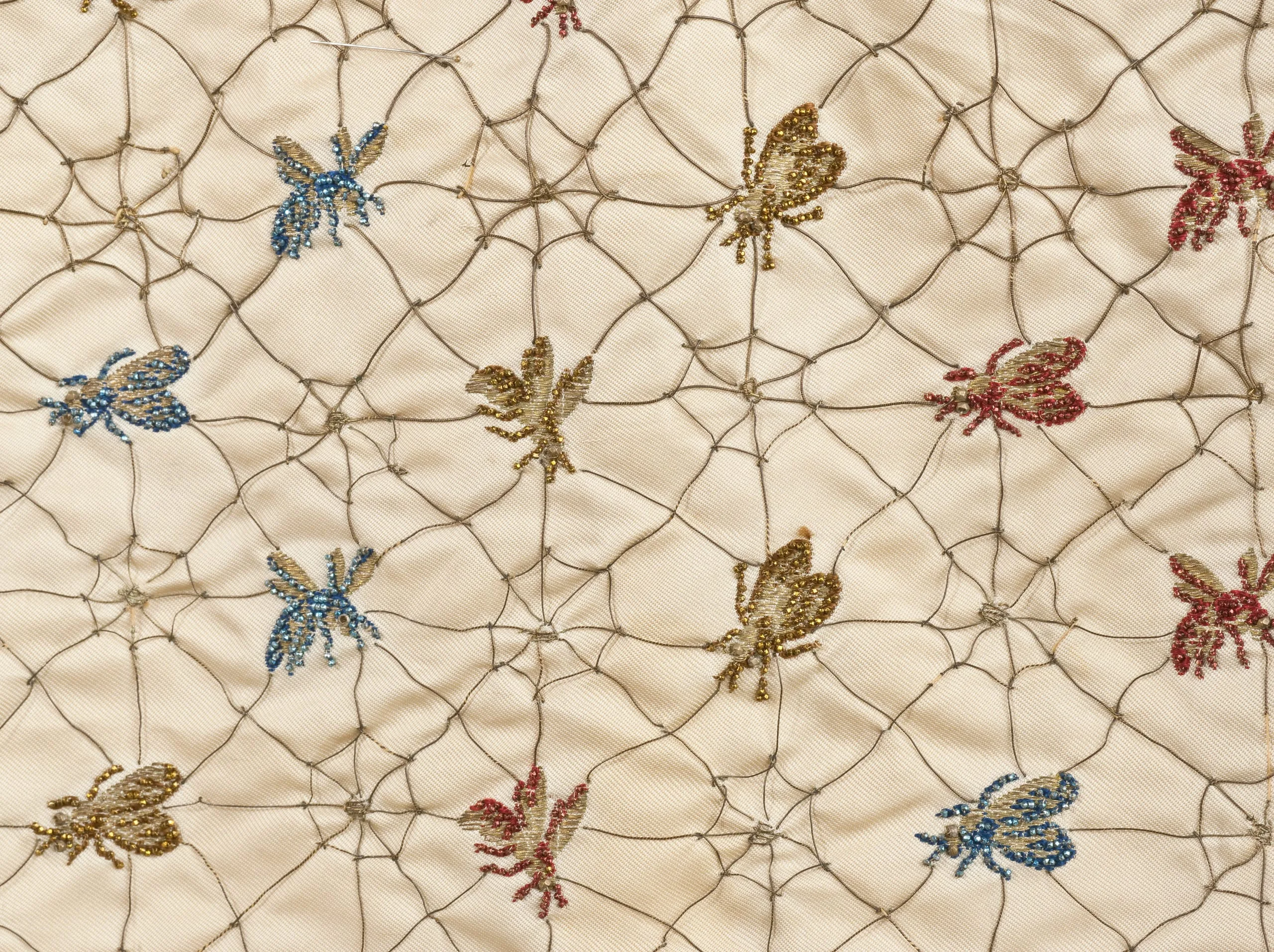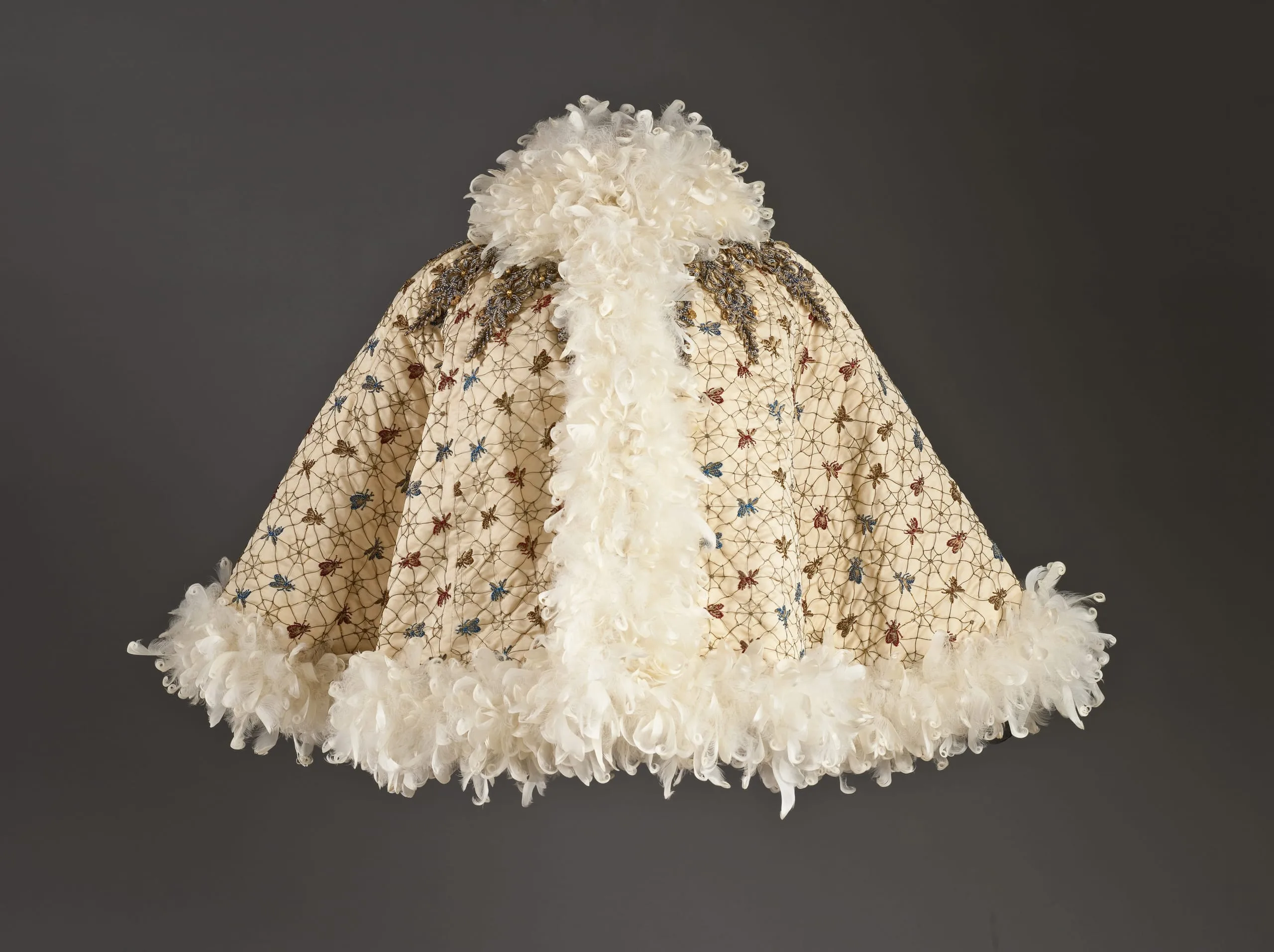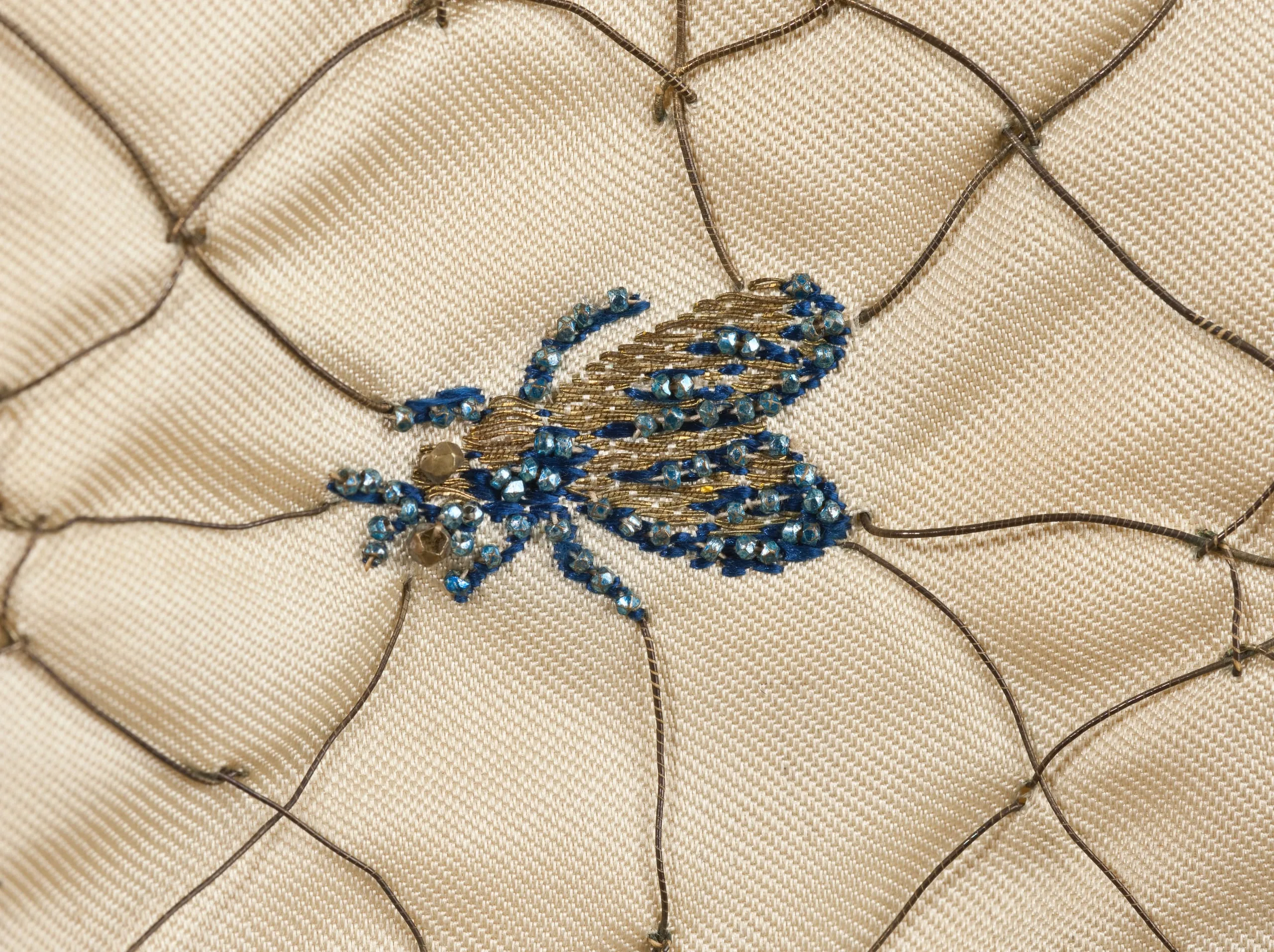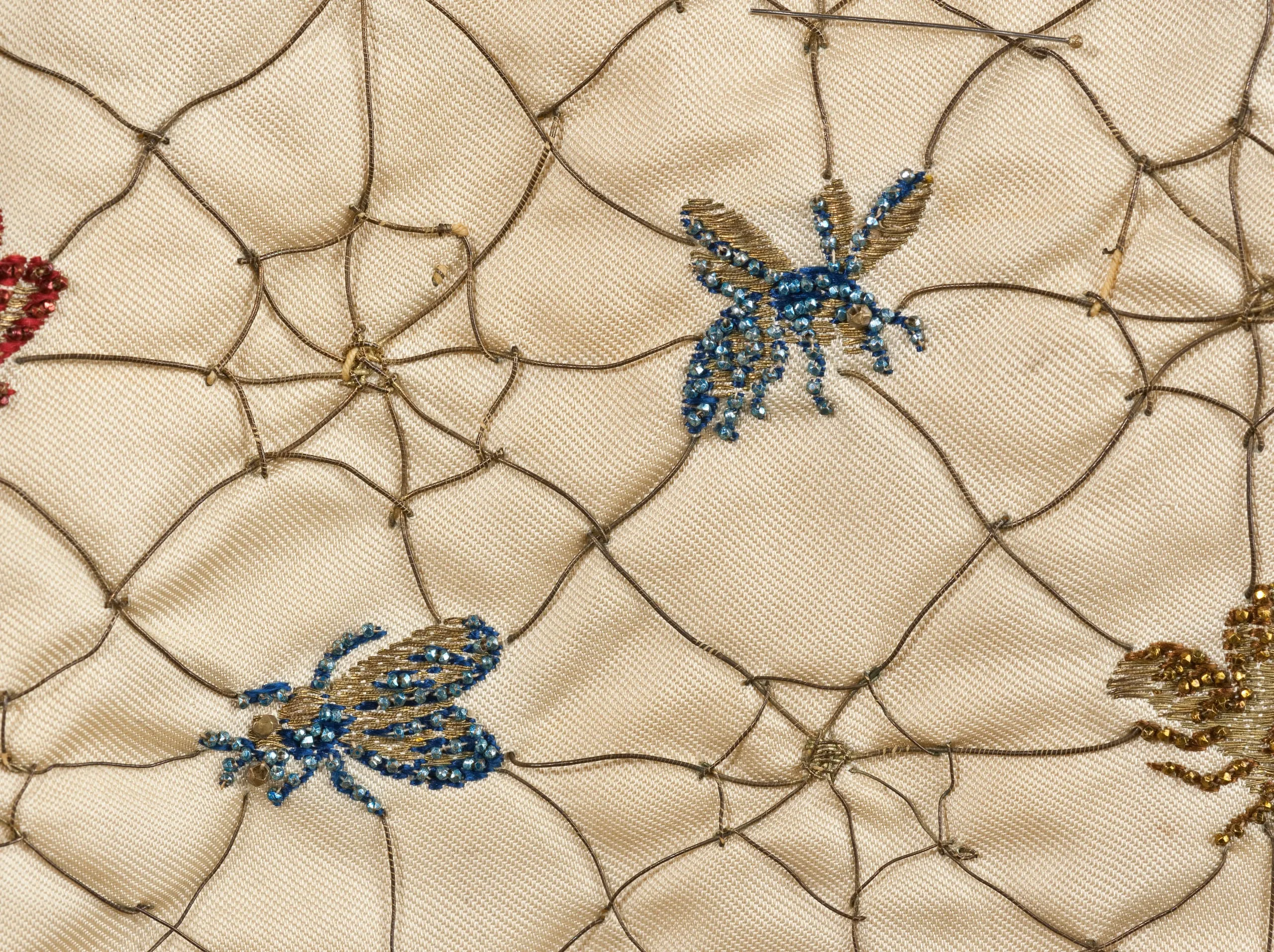 - Silk twill with metallic-thread supplementary weft patterning, glass beads, metal beads, metal sequins, metallic-thread embroidery, and feathers