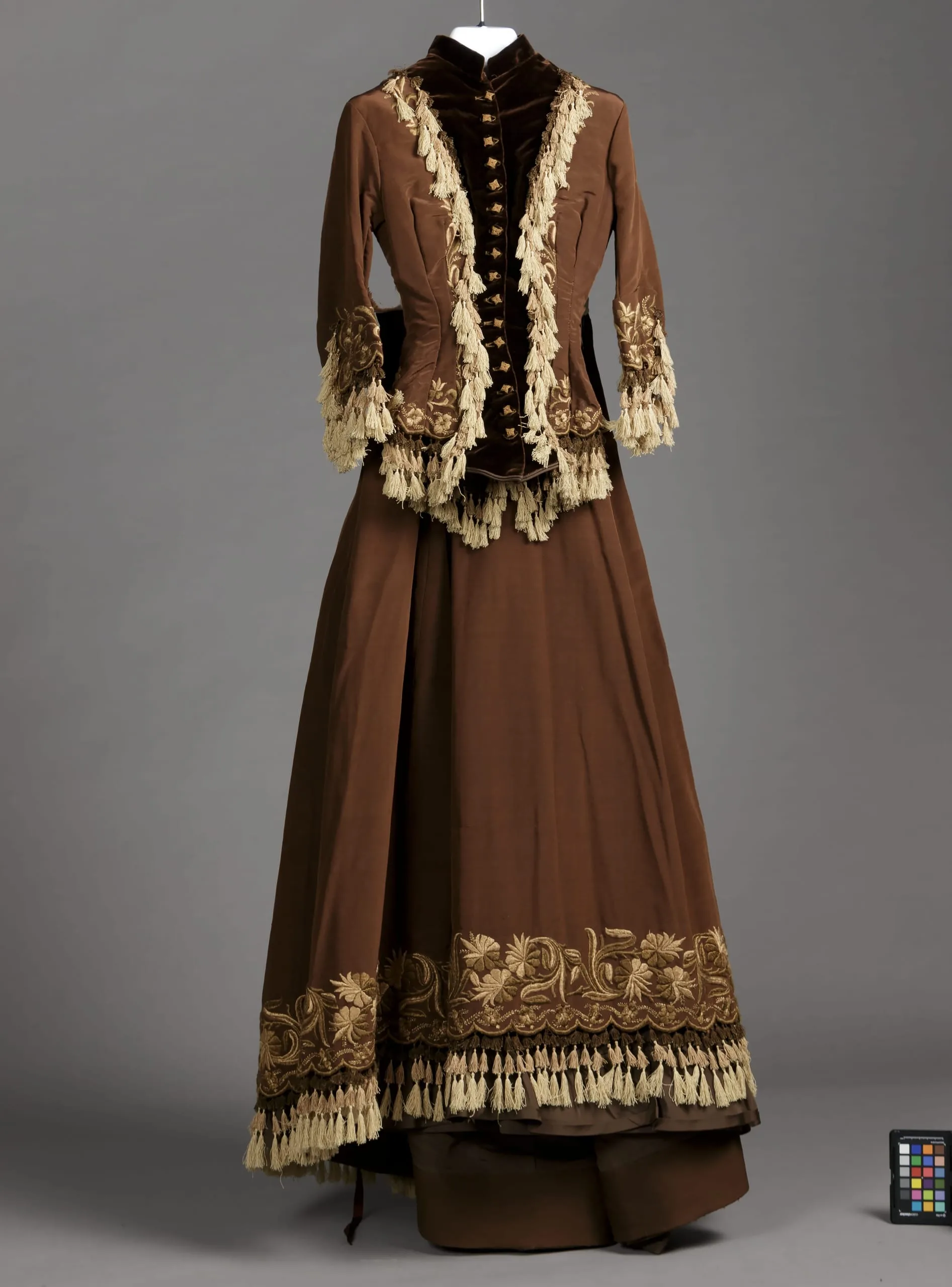 - Bodice: silk warp and wool weft plain weave (faille), silk velvet, with silk embroidery and silk tassels; Underskirt: silk plain weave (faille), silk velvet ribbon trim; Overskirt: silk warp and wool weft plain weave (faille), with silk embroidery and silk tassels; Belt: silk plain weave (faille).