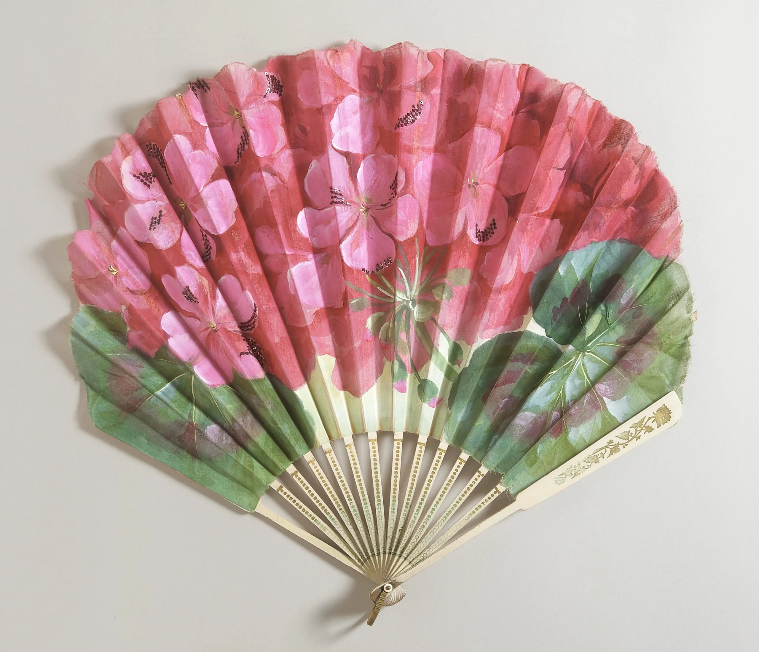- Organdy leaf with sequins, wood sticks, brass metallic loop, celluloid button, silver metallic rivet