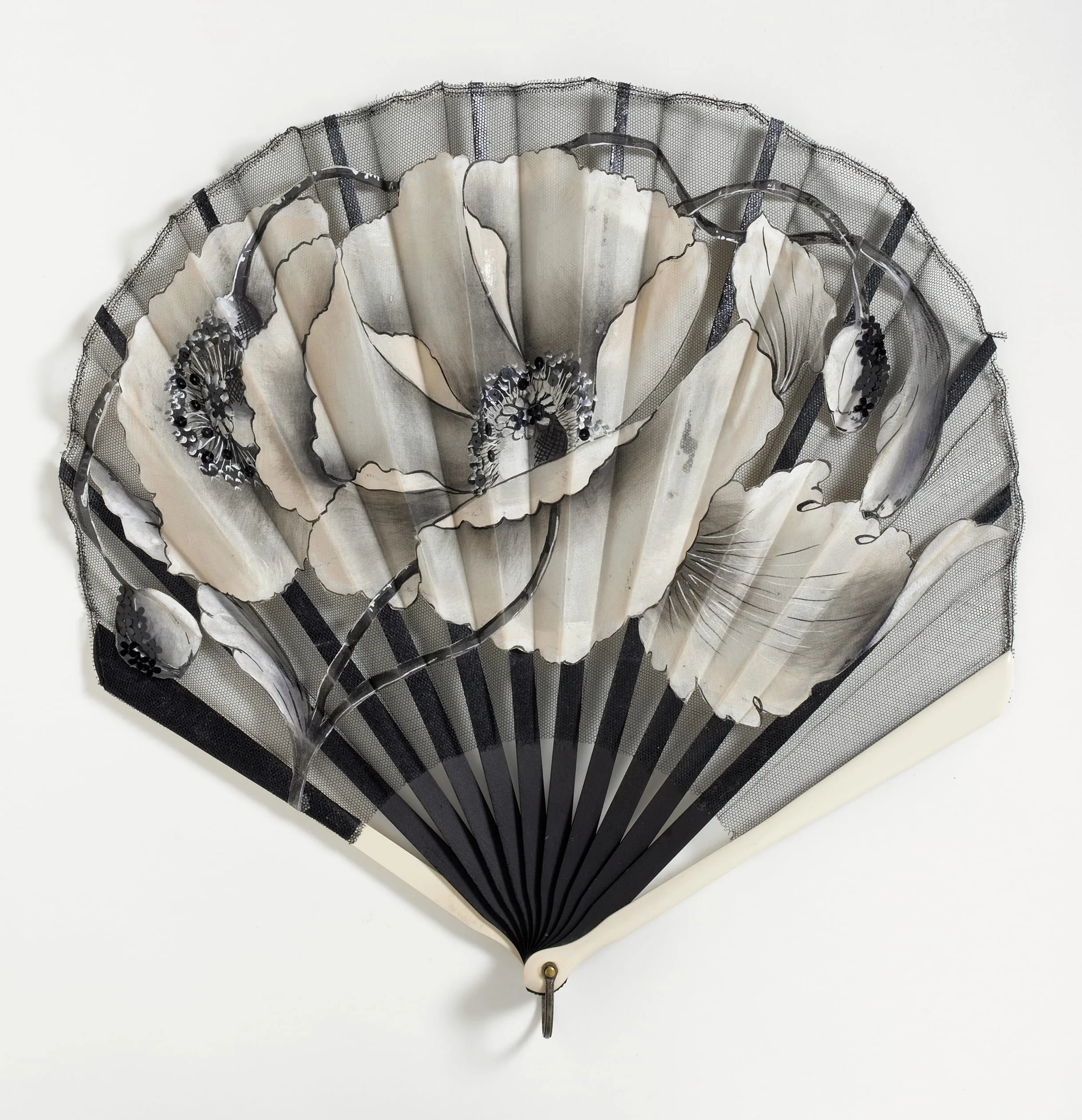 - Painted silk leaf, wood sticks and synthetic ivory guards, silver metallic loop, gold metallic rivet