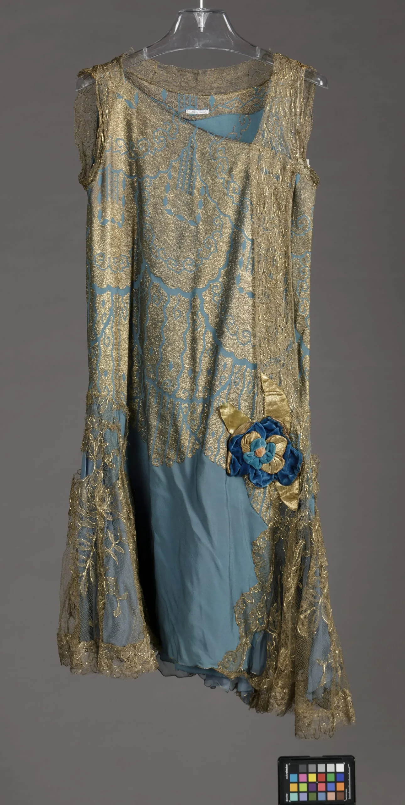 - Silk plain weave (crepe) with metallic-thread supplementary warp patterning, and silk plain weave (chiffon), with silk velvet ribbon, metallic plain weave ribbon, and metallic lace