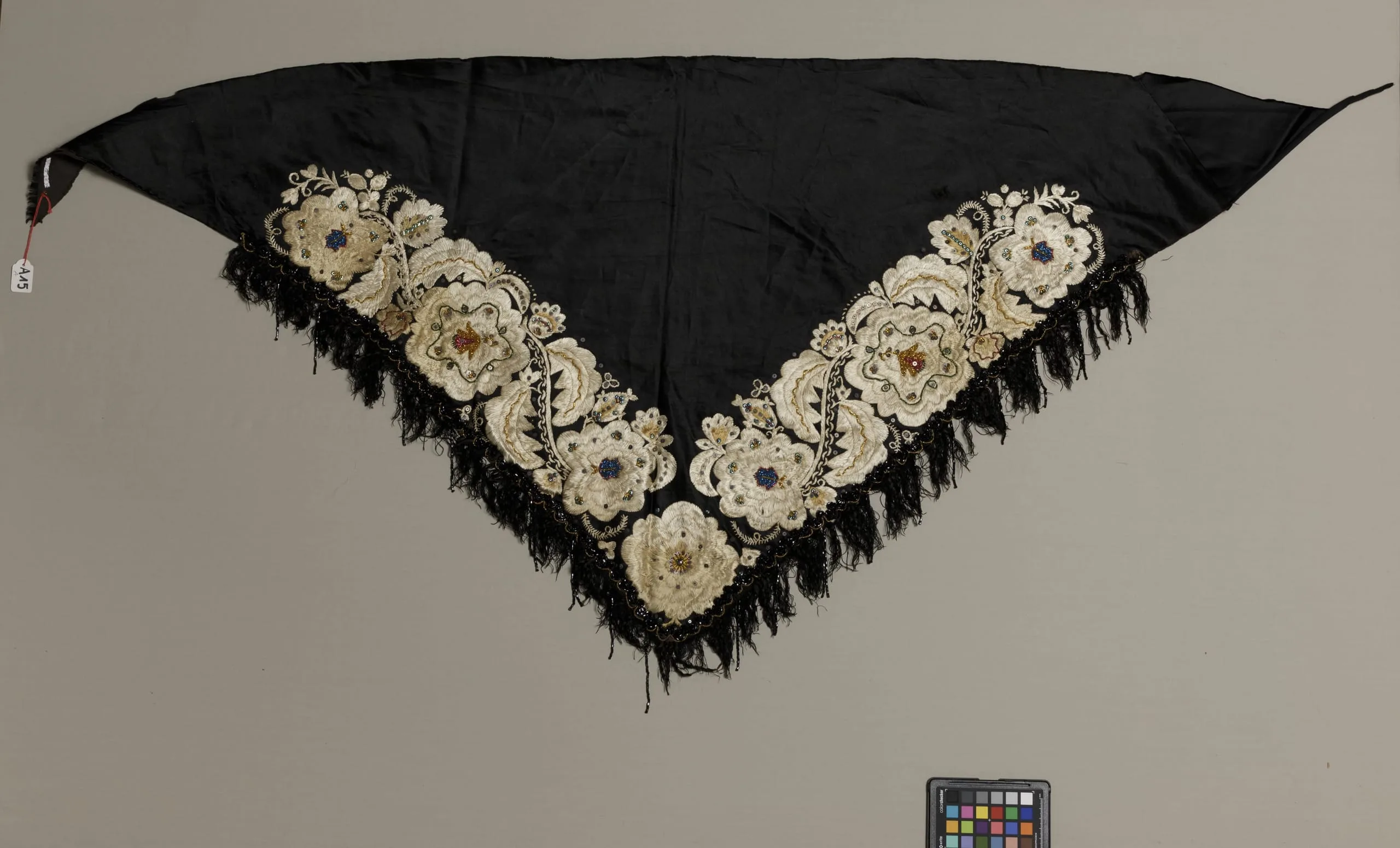 - Silk satin with silk and metallic-thread embroidery, glass and metal beads, metal sequins, and silk and cotton fringe