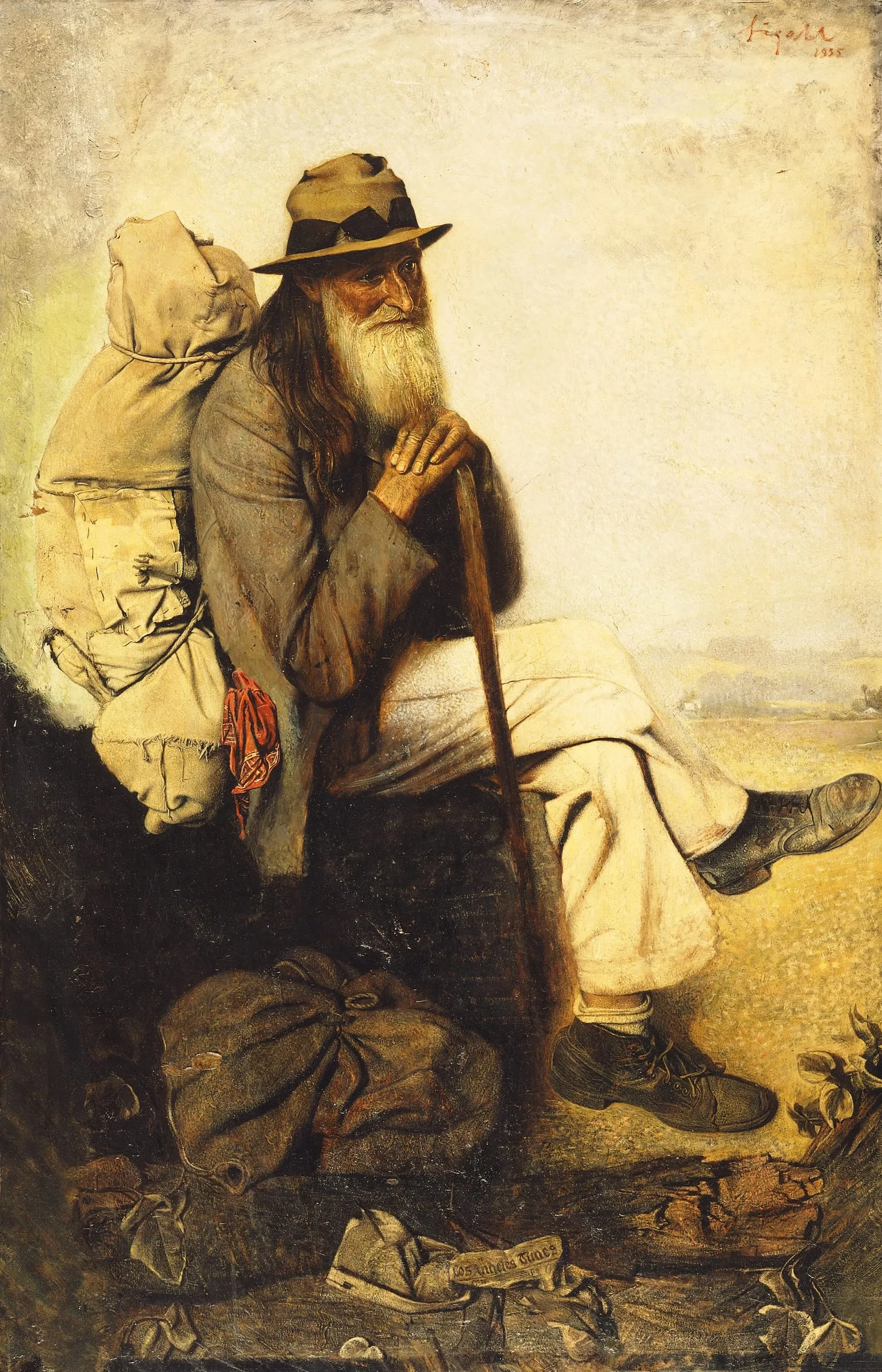This painting came to the museum with no title but has been called The Wanderer because of its subject matter. The image of the Wandering Jew in art dates back several centuries and took on many levels of meaning, often referring to a person on the fringes of or outside of society. Sigall, who may have been Jewish, might have intended this elderly man to allude to his own emigrations. However, the wanderer was quite an appropriate subject during the Great Depression, during which thousands of people were displaced, some of them forced to live as hobos. In this painting Sigall has presented in quite sympathetic terms an old man who stops to rest and contemplate his situation. A tear stands on his eyelid. Although the background does not seem to be the depiction of a specific locale, the remnants of the front page of a Los Angeles Times in the immediate foreground place the wanderer in the Southern California area.