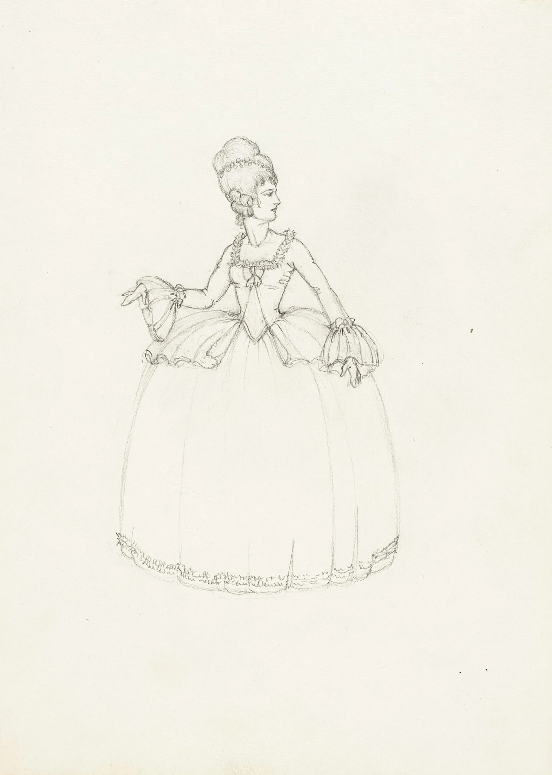 Pencil drawing on cream paper, full-length figure of a woman in profile wearing an 18th-century dome-skirted gown with puffed cuffs and upswept hair