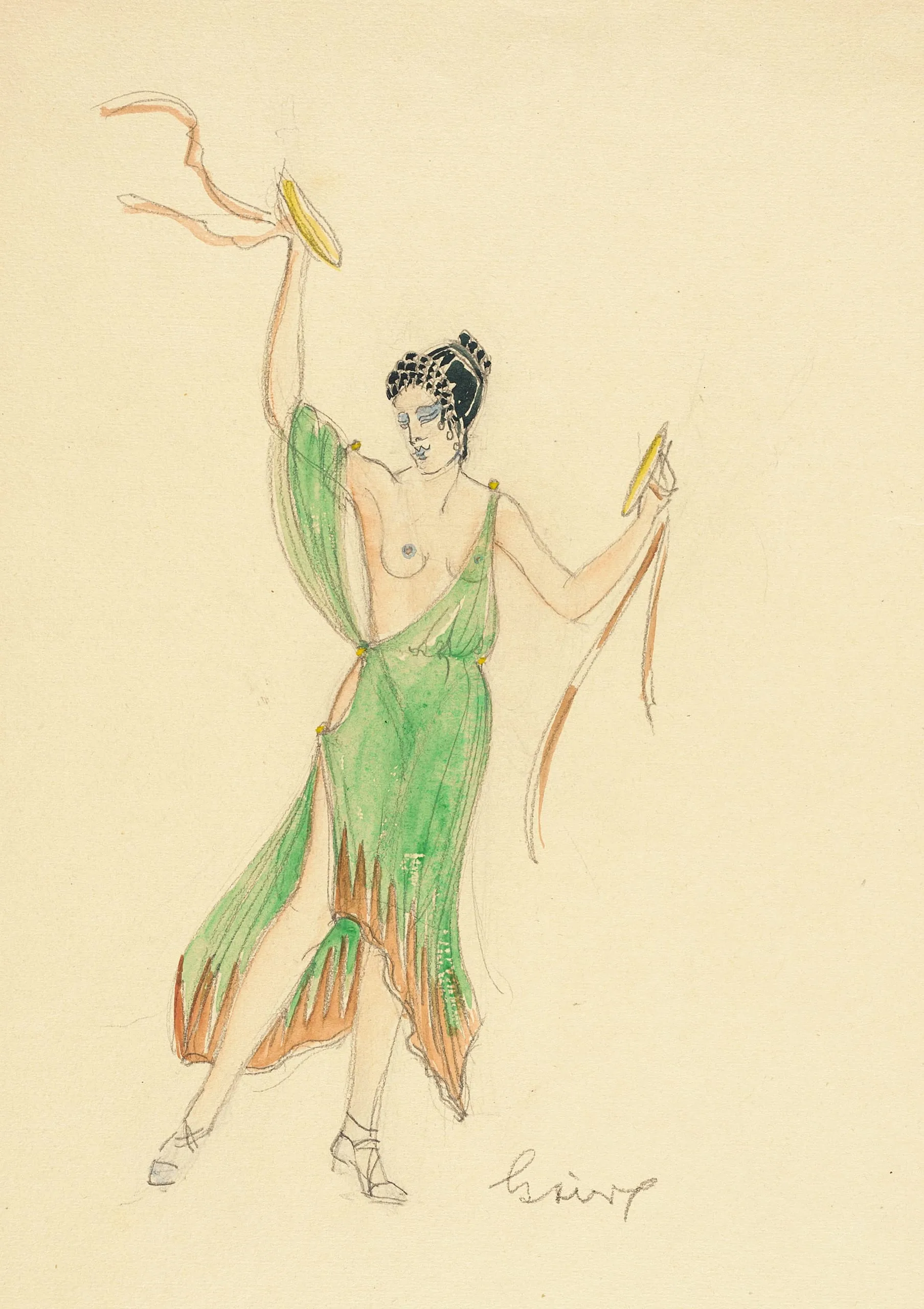 Pencil and watercolor drawing on cream paper of a full-length dancing female figure in a flowing green and coral gown, arms raised holding ribbon streamers and yellow tambourine-like discs