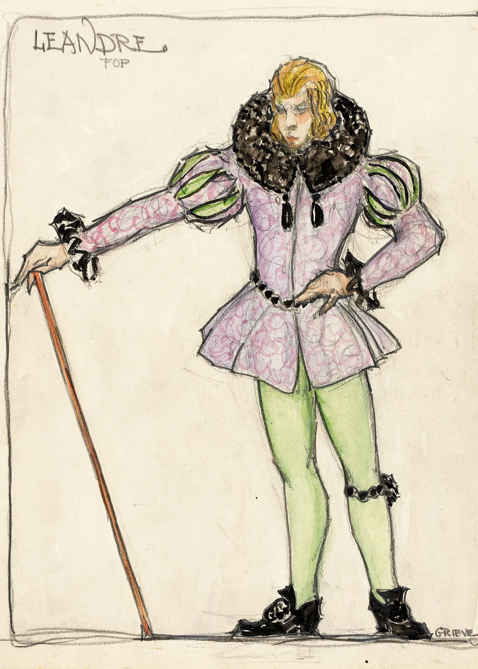 Watercolor and pencil costume design drawing of a male theatrical figure in a lavender doublet with fur collar, green tights, and a walking cane