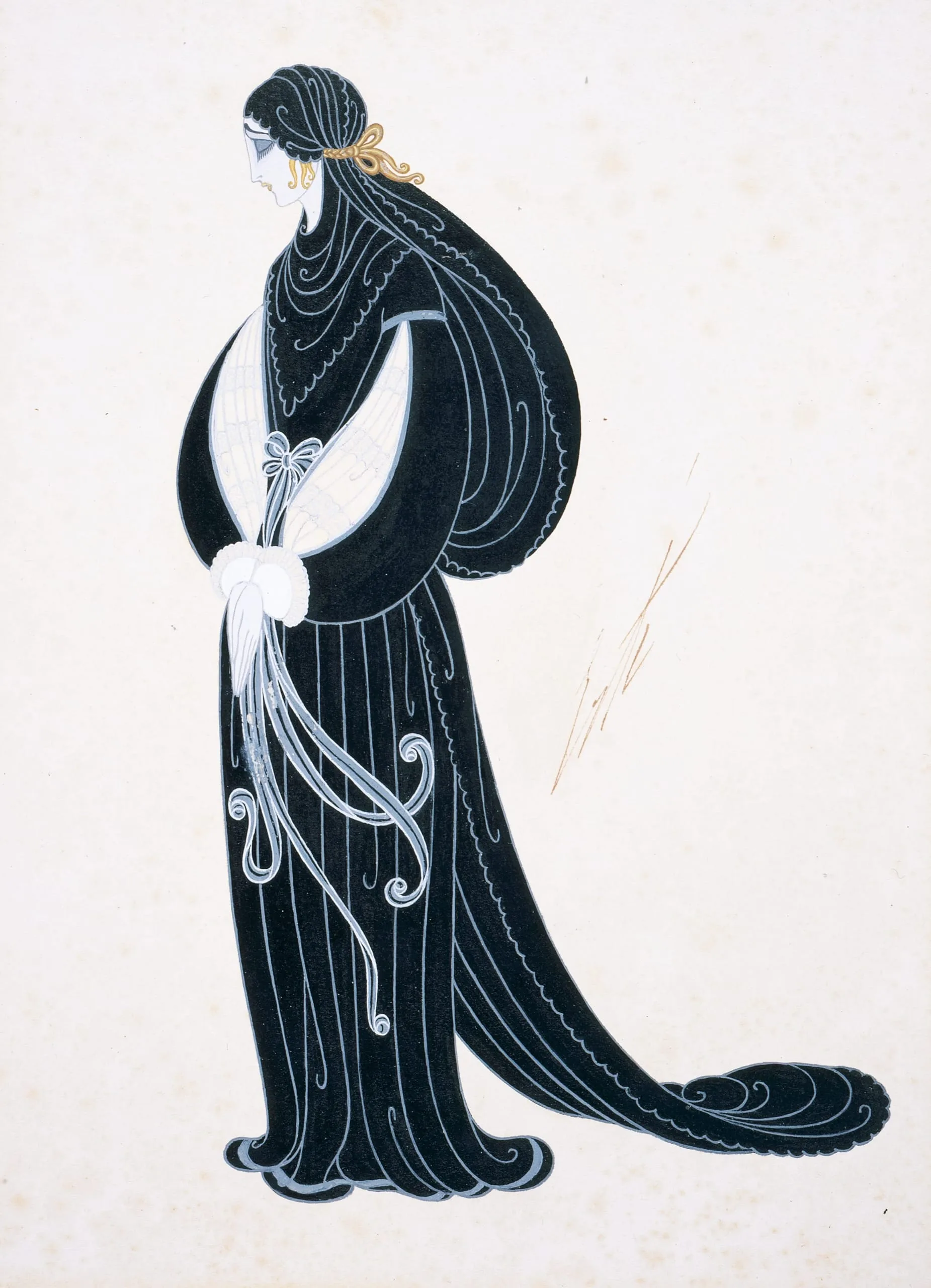 Gouache and ink drawing, stylized full-length female figure in profile wearing a sweeping black gown with white pinstripes and Art Nouveau swirling ribbon details, large draped veil cascading down her back