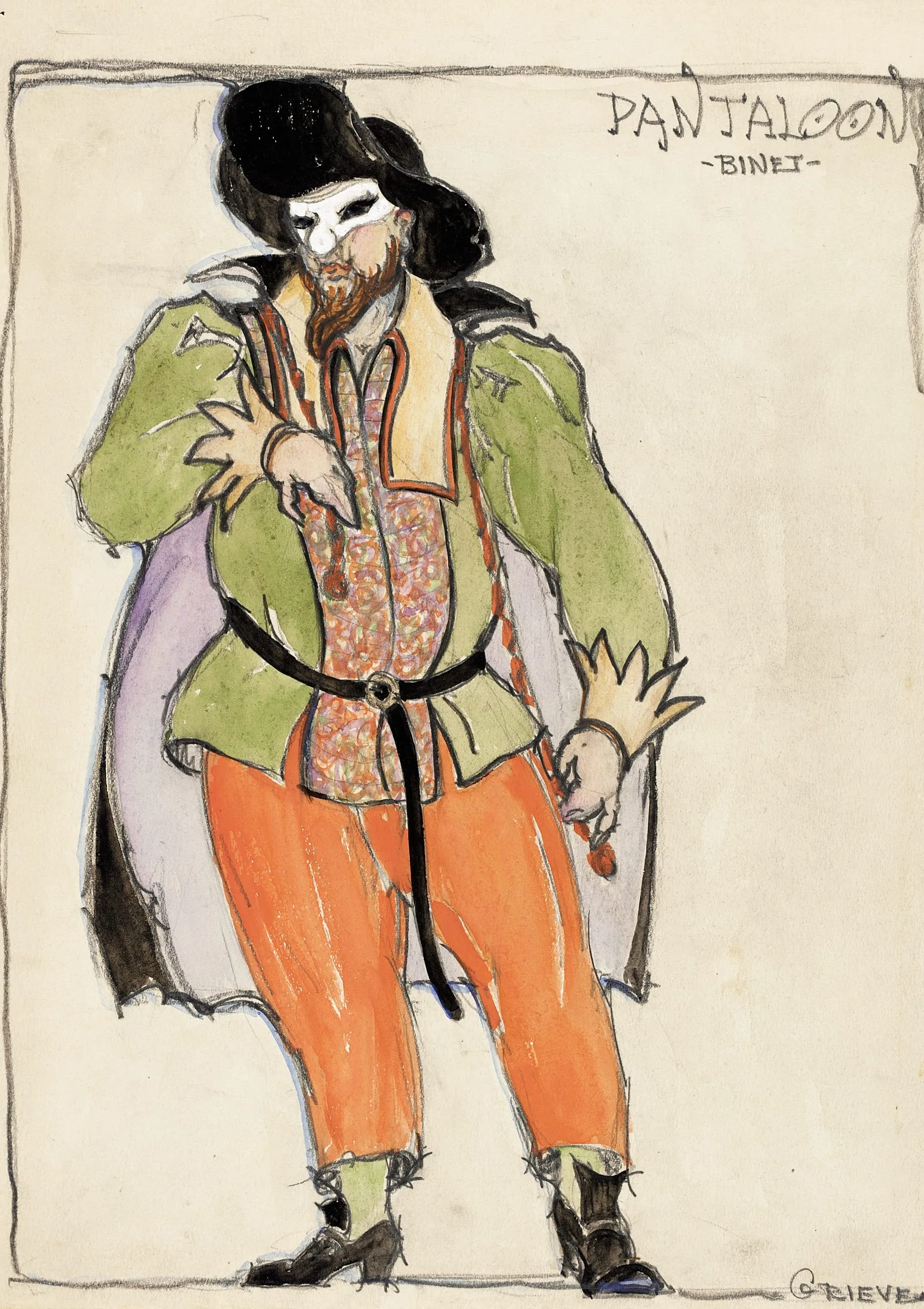 Watercolor and ink costume design drawing of a masked, bearded figure in orange trousers, green doublet, and black hat, with hands outstretched