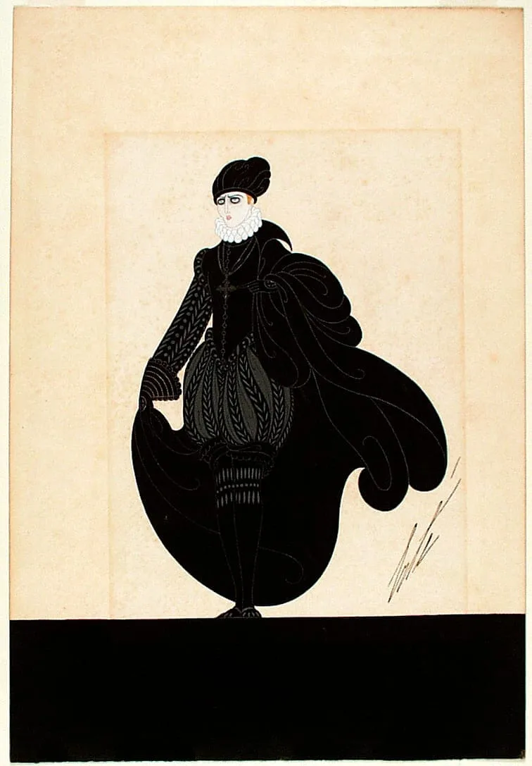 Drawing in black ink and gouache of a full-length figure in an elaborate black costume with a sweeping cape, ruffled collar, and puffed sleeves, rendered in a flat graphic style
