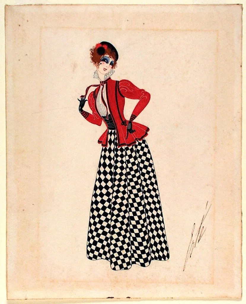 Costume design drawing in ink and gouache showing a full-length woman seen from behind, wearing a red jacket with puffed sleeves and a black-and-white harlequin diamond skirt