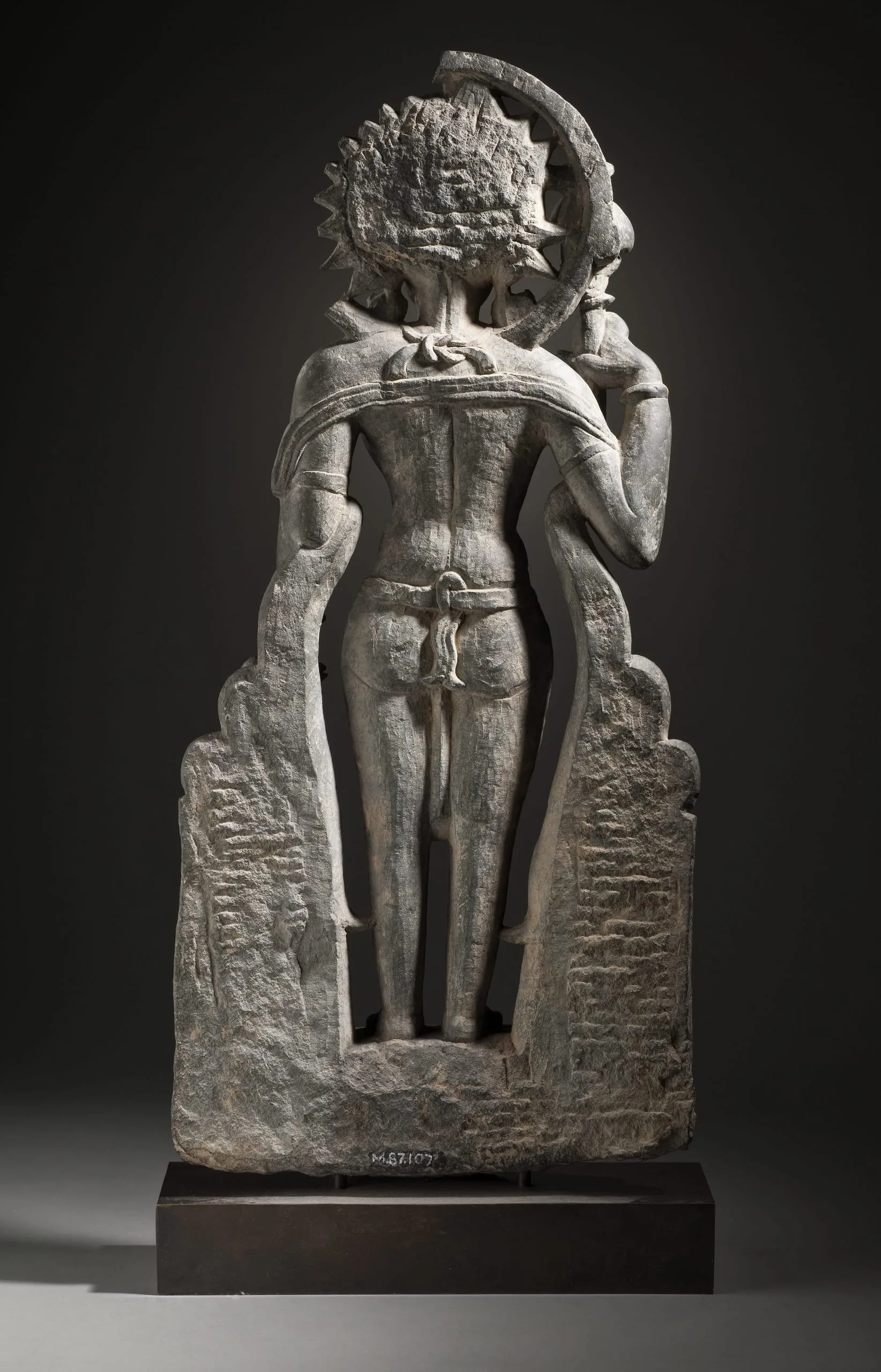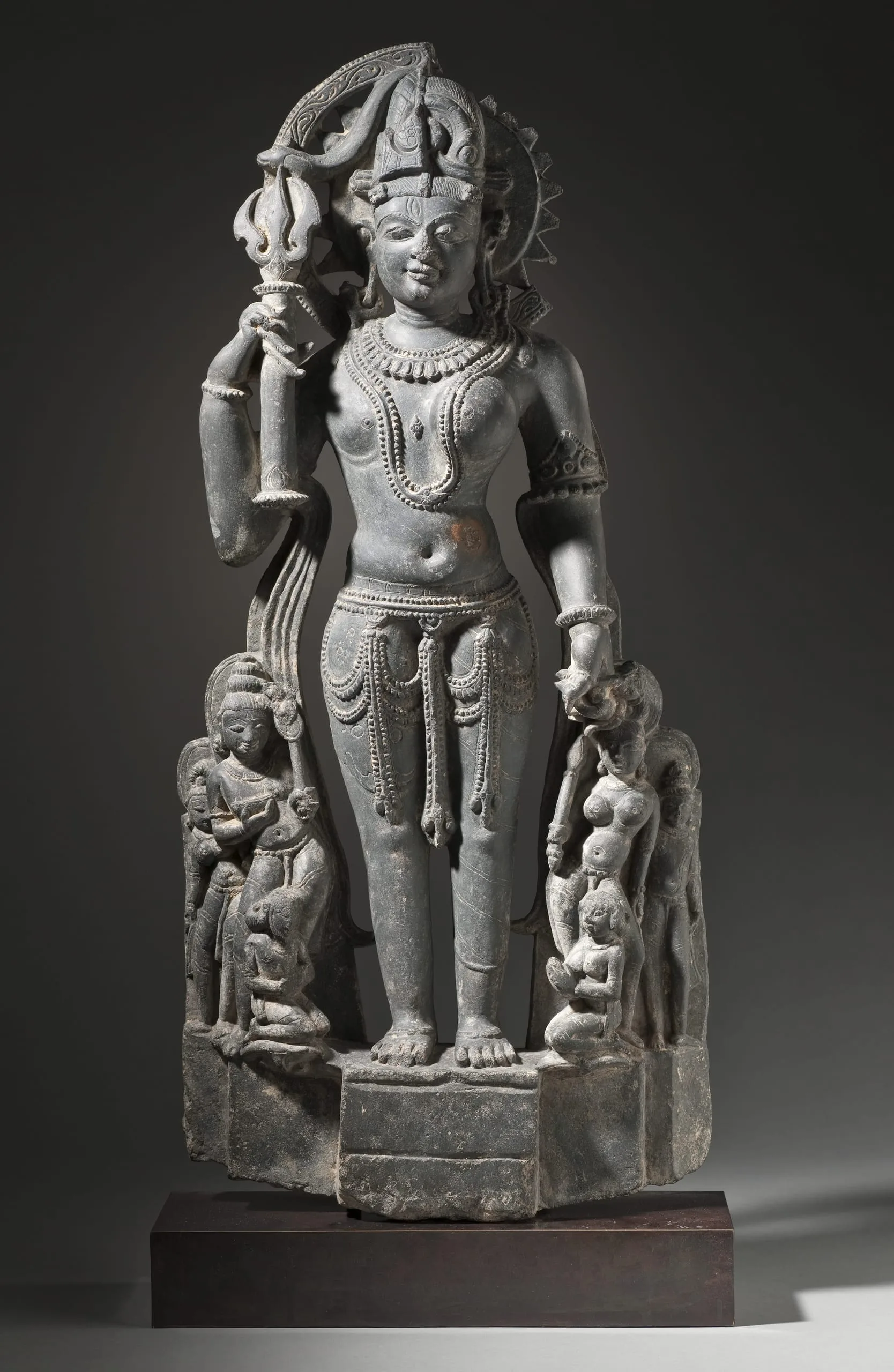 Ardhanarishvara is always represented as the right half of Shiva joined with the left half of Parvati. Accordingly, the two sides of the sculpture are represented with different physical features, types of garments, and iconographic attributes. On the right, Shiva has a third eye of wisdom (jñana netra) and holds a trident (trishula). On the left, Parvati has a breast and holds a lotus in her dangling arm. Each site has an attendant figure corresponding to its gender, and a smaller attendant of the opposite gender. Donor figures in adoration flanked the deity. The back is roughly finished with only the main figure being delineated.